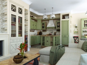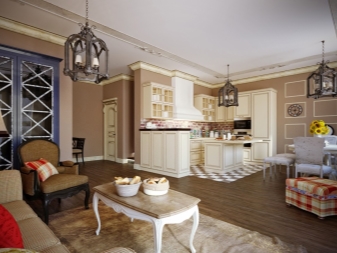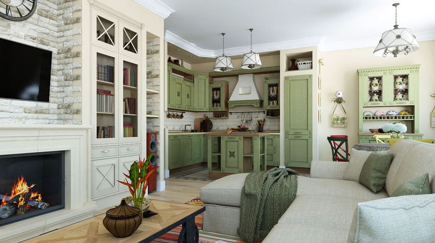 Studio-Apartment im Landhausstil kann eine eher originelle Lösung sein. In diesem Stil verwendete Holzmöbel von einfachen Formen, Textilien in einem Käfig, Baumwolle und Leinen.