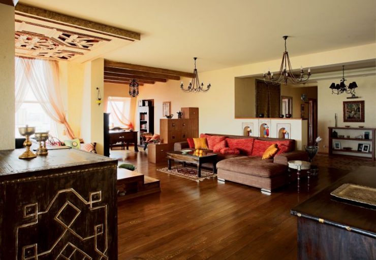 Diese stilistische Entscheidung zeichnet Strenge und Prägnanz aus. Die Möbel hier sind massiv, aus Holz. Die Töne sind überwiegend beige und braun. Erlaubt und helle Farben in Textilien, aber mit einem klassischen Ornament, zum Beispiel die Verwendung von Plaid Plaid.