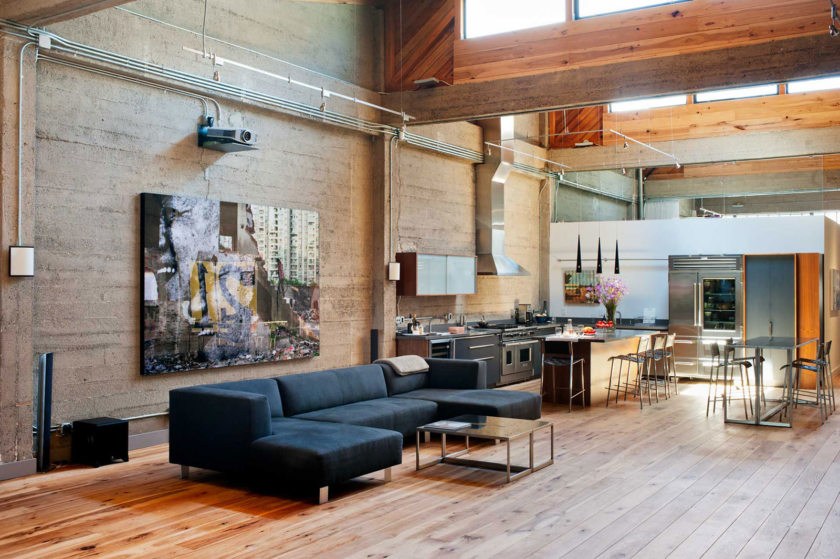 Den Boden in einem solchen Raum zu dekorieren ist ausgezeichnet geeignete Materialien, die Beton oder Naturholz nachahmen. Der bevorzugte Farbton für Holz ist hier grau, obwohl auch natürliche Farbtöne auftreten können. Da der Loft-Stil mit dem Geist des vergangenen Jahrhunderts durchdrungen ist, sollten die Böden auch ziemlich abgewetzt sein. Die Beschichtung sollte gealtert werden, mit Imitation von verschiedenen Unregelmäßigkeiten: Kratzer, Abschürfungen der Lackschicht.