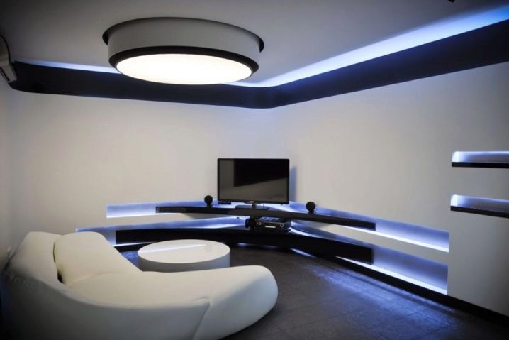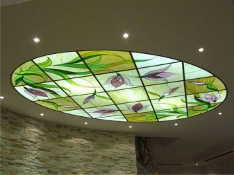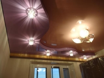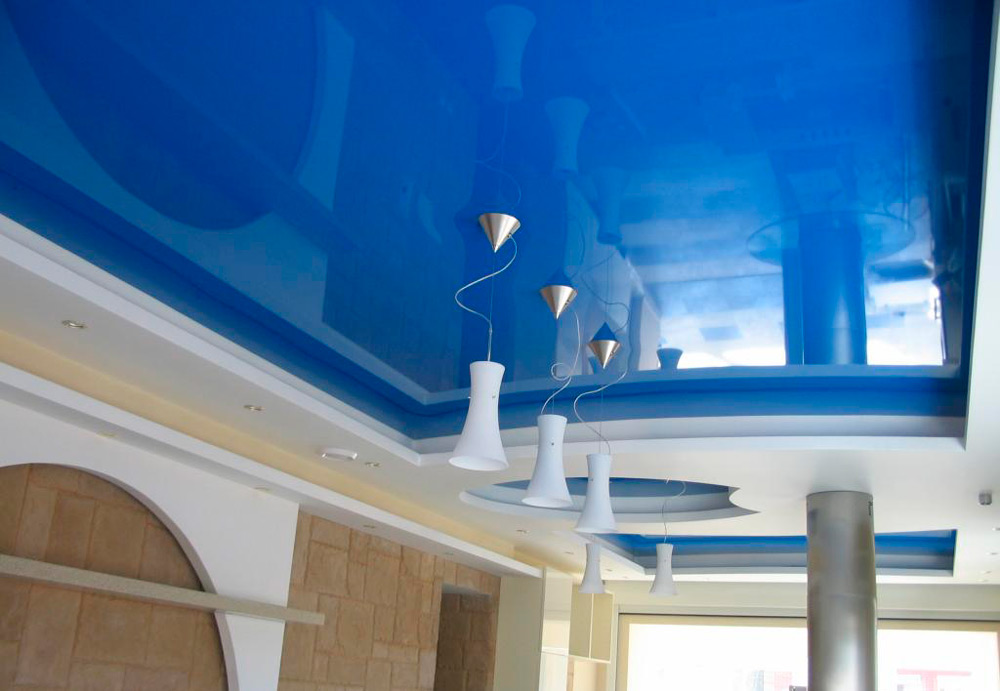 Spotlights (sogar ein schwaches Leuchten) an einer solchen Decke sehen aus wie Sterne. Durch den Aufbau von mehrstufigen Kompositionen mit Gipsplatten und dem Einlegen einer Leinwand erzielen sie den Effekt eines nahezu natürlichen Bildes von Wasser oder Himmel.