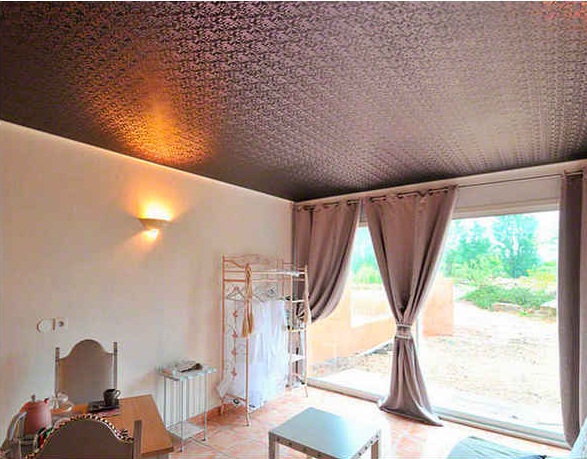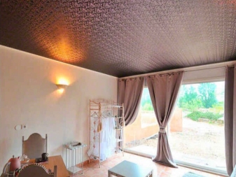 Die Decke in diesem Stil ist aus natürlichem Material gefertigt. Es sollte perfekt aussehen, aber gleichzeitig einfach aussehen. Die Farben sind zart, es ist durchaus logisch, ein Ornament anzuordnen. Tapeten können natürliche Arten und unauffällige Töne sein. Nun, wenn das Bild mit der Decke übereinstimmt.