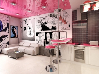 Der Stil der Spaßjugend. Die Decke wird irgendwelche, sogar chaotischen Bilder annehmen, wenn sie nur bunt sind. Wenn die Decke hell, aber monophon ist, sollte die ganze Gewalt der Farbe auf die Tapete wirken.