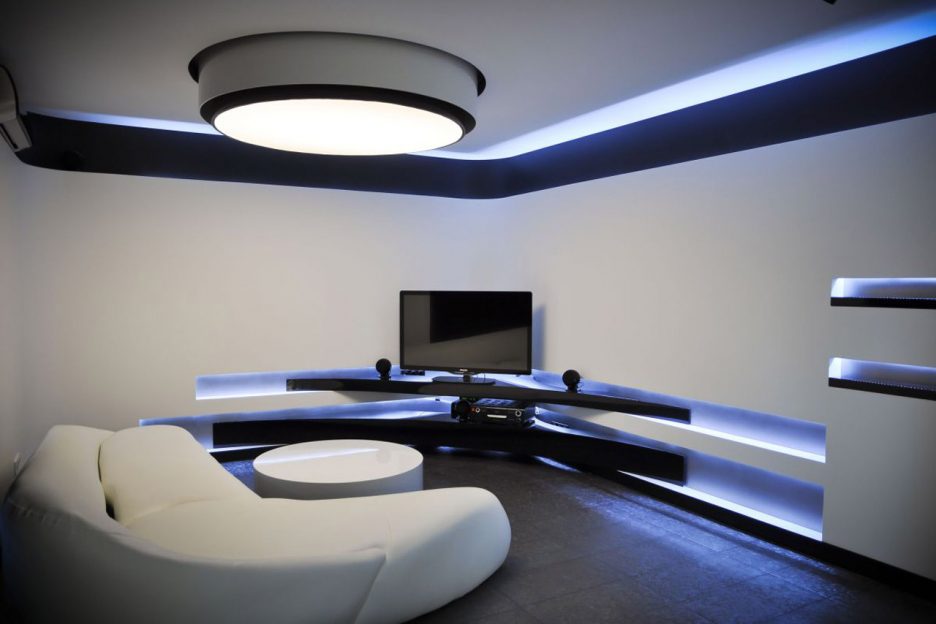 Er mag klare Geometrie und Kontrast. Die Decken sind sehr glatt und glatt. Gleiches gilt für Trockenbaukonstruktionen. Beleuchtung arbeitet am Spiel von Licht und Schatten. Die Wände sind glatt, keine Extras.