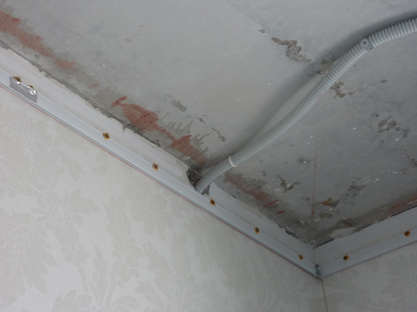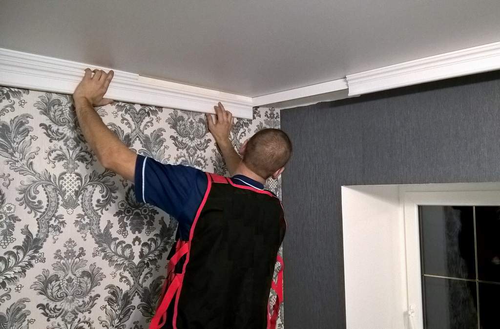 Ein Vakuumbohrhammer würde helfen, dieses Problem in gewissem Maße zu lösen. Kleben Sie die Bleche vor dem Einbau des Deckenrahmens, damit sie unter das Baguette gelangen. Er drückt die obere Kante der Leinwände herunter, was es schwierig macht, die Tapete bei der nächsten Reparatur zu zerlegen.. Der positive Punkt ist die perfekte obere Kontur der Wand.