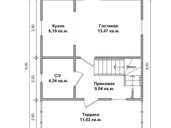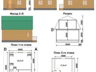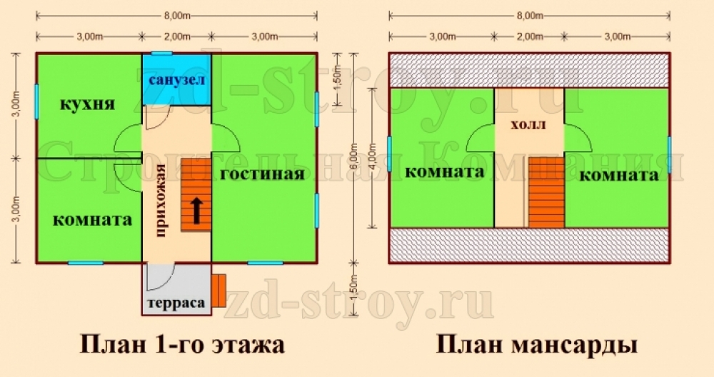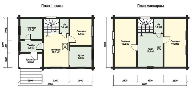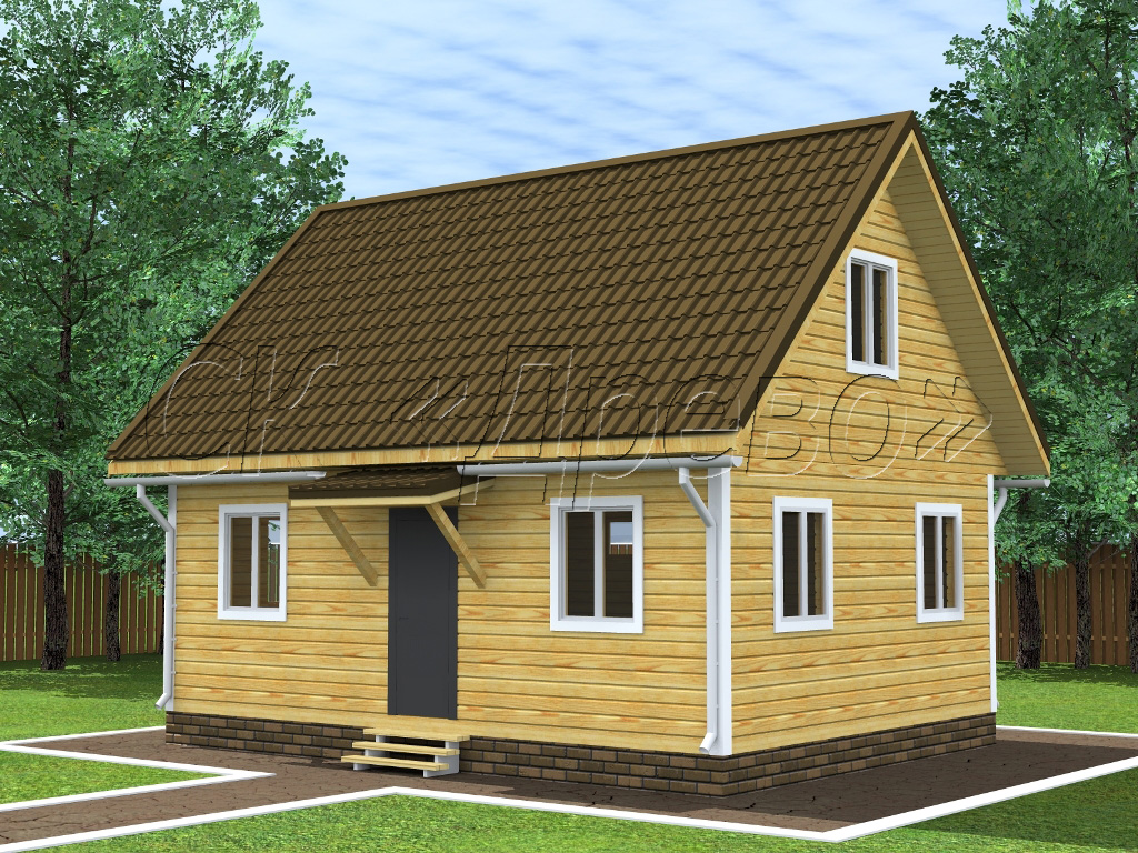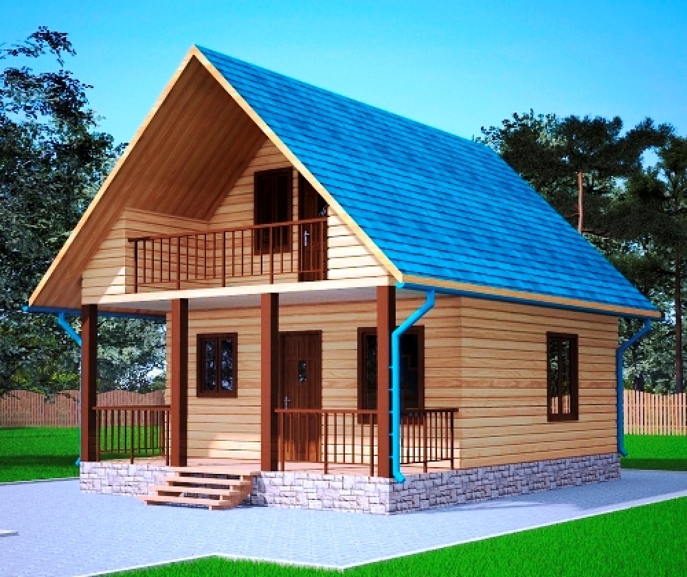 Betrachten Sie die beliebten 6x8-Projekte. Der erste Plan, 6in8, impliziert eine Etage und einen Mansardenaufbau. Nach den Zeichnungen befinden sich im ersten Stock ein Schlafzimmer, ein Wohnzimmer, eine Küche und ein WC.Der Mansardenaufbau kann mit jeder Treppe ausgestattet werden, und der Raum selbst kann nach dem Ermessen des Eigentümers ausgestattet werden.