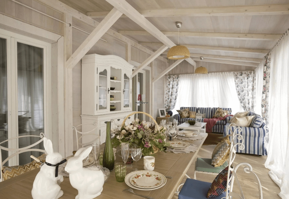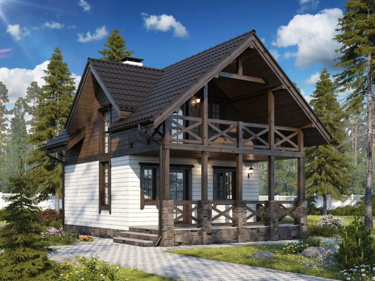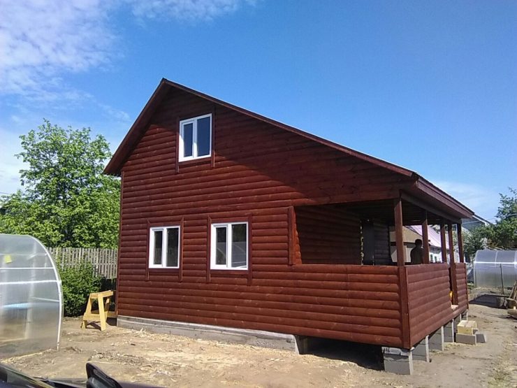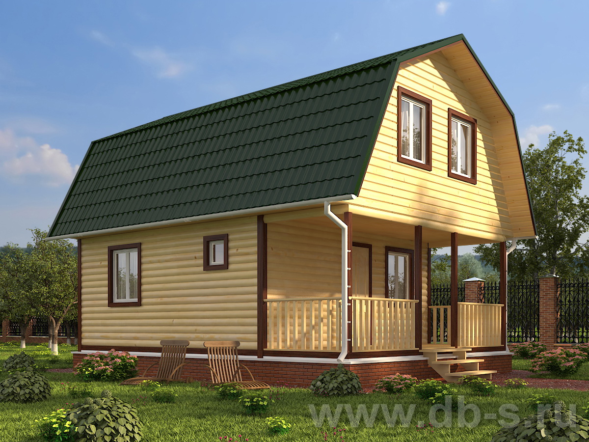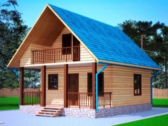 Ein weiteres kompaktes Holzhaus, dessen Fläche durch die Anordnung der Terrasse erweitert wird. Auf einem solchen Schuppen wird es auch im Regen angenehm sein. Die Überdachung und die ausgestatteten Wände lassen kein Wasser hinein. Auf dieser Veranda können Sie Schuhe lassen. Daher benötigt das Haus keinen Platz für einen Flur.