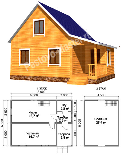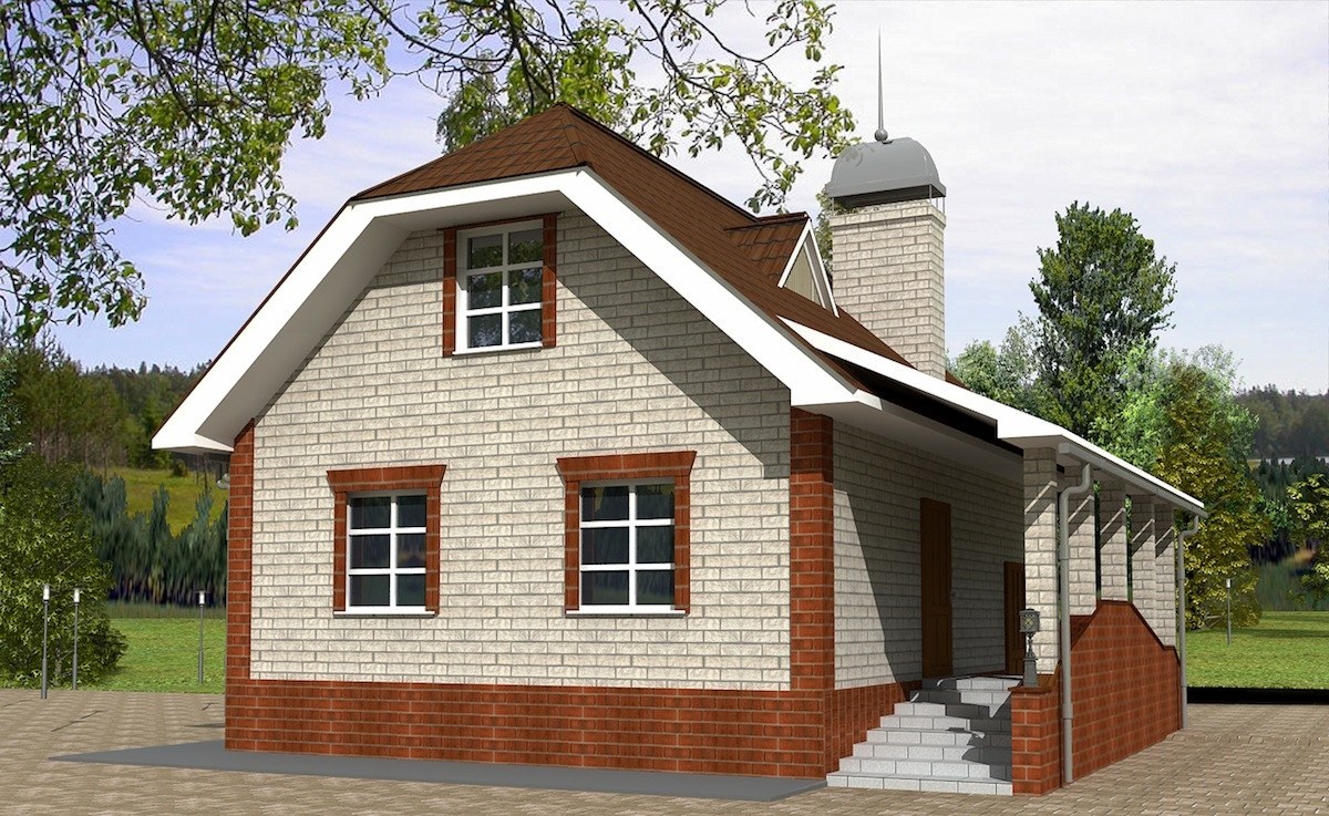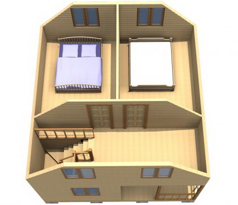 Haus 6 bis 8 mit einem Dachgeschoss sieht ziemlich kompakt aus. Dennoch können Sie im Inneren multifunktionale Räume einrichten, in denen sich alle bequem unterbringen lassen. Oder der Raum kann offen bleiben. Die letztere Option ist für zwei geeignet.