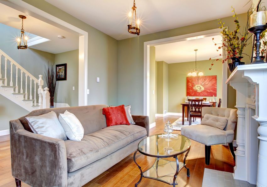 Beachten Sie, wie das kombinierte Wohn- und Esszimmer in diesem Haus. Diese Zimmer befinden sich im ersten Stock.