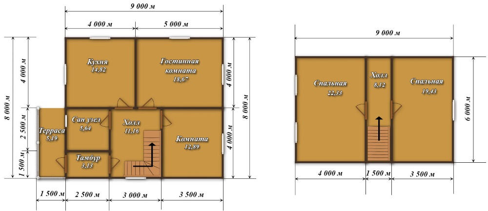 Auf großen Grundstücken entstehen geräumige Häuser mit den Maßen 8x8, 9x9 oder 7x9, 8x10. In der Regel sind dies eher teure Projekte für eine große laute Familie. Sowohl außen als auch innen sehen solche Häuser luxuriös aus und sind die Hauptattraktion der gesamten Vorortsiedlung.