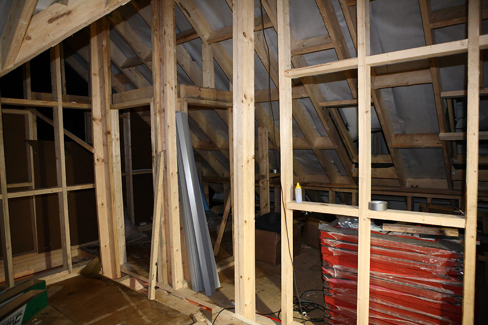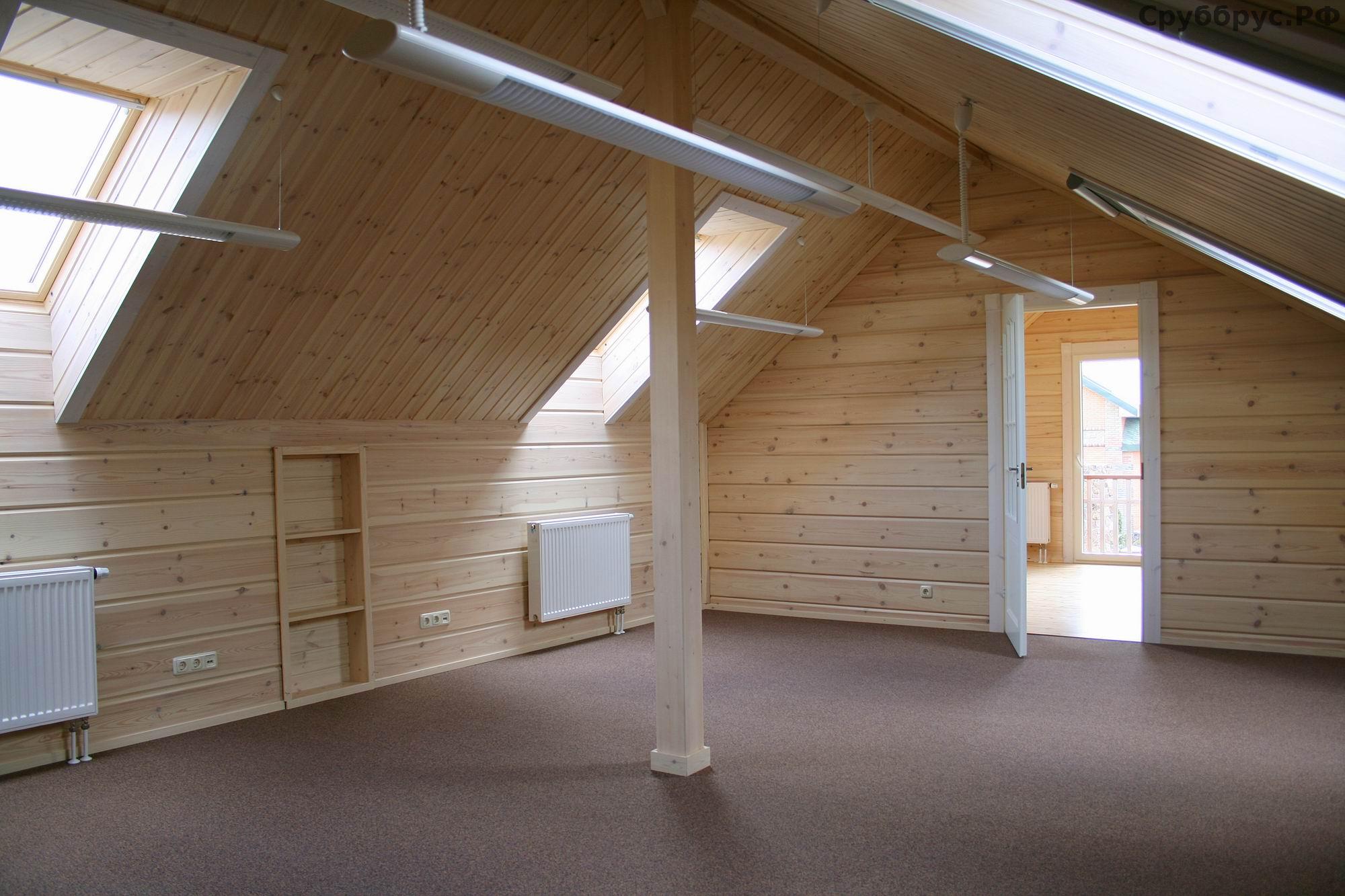 Wie für die Innenwände der unteren Etage und Dachboden,hier sind die Wände auf der Dämmung (meist Mineralwolle) mit Holzspanplatten (FBD), Holzfaserplatten (Faserplatten), Schindeln oder Sperrholzplatten ummantelt, auf die eine dekorative Putzschicht aufgetragen oder Tapeten geklebt werden können.