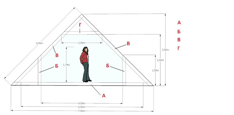 Nach dem derzeitigen SNiP die Grenze des Schnittpunkts der Dachebene und der Wand eines Gebäudes sollte nicht mehr als eineinhalb Meter von der Dachbodenlinie entfernt sein. Die Höhe des Dachbodens selbst darf nicht weniger als zweieinhalb Meter betragen und sollte mindestens die Hälfte der Fläche des gesamten Raumes einnehmen (siehe Abbildung unten).