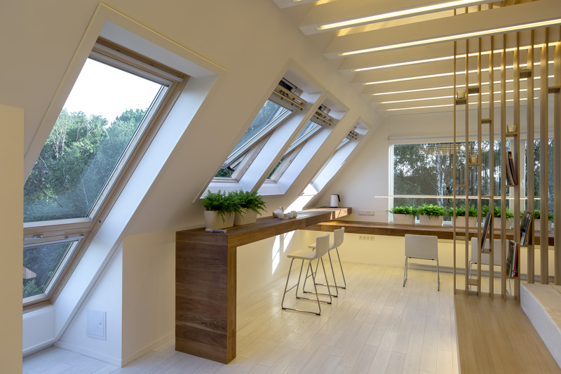 Eine interessante Lösung wäre die Installation großer Fenster im Dachgeschoss. In der Nacht, bevor Sie schlafen gehen, können Sie den Blick auf den Sternenhimmel genießen, und am Nachmittag können Sie beobachten, wie die Wolken über den Himmel schweben. Kurz gesagt, diese Option eignet sich für romantische Naturen.