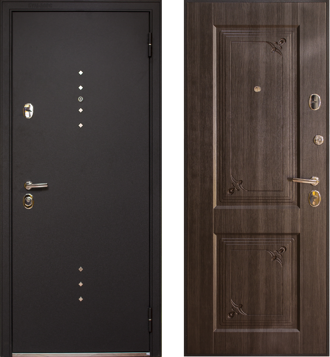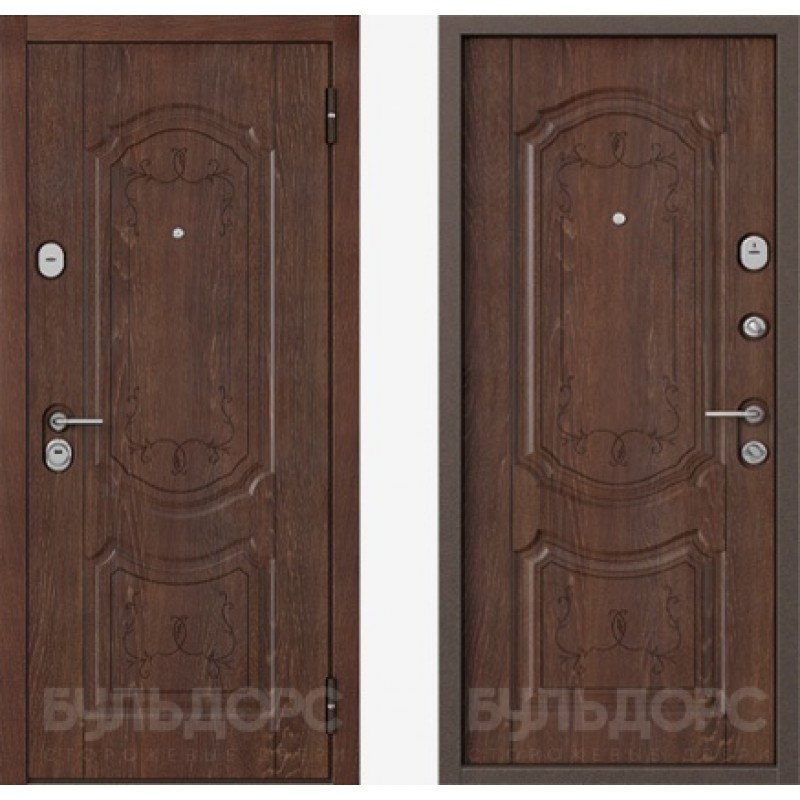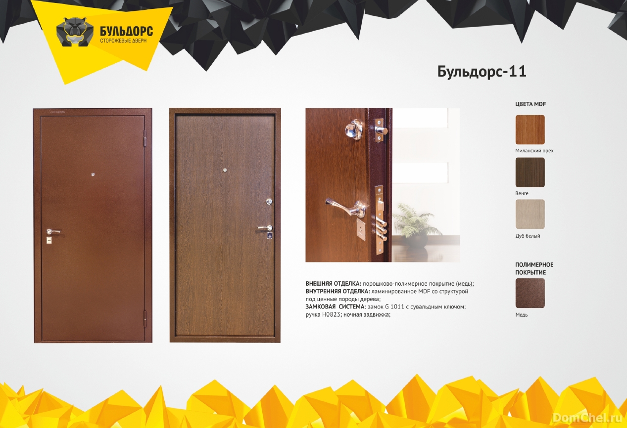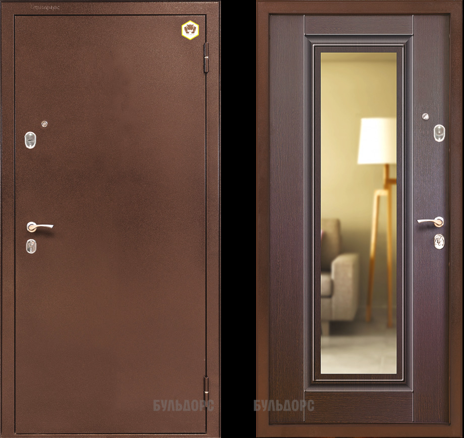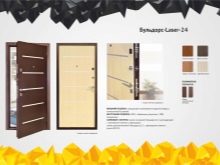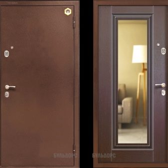 Die äußere Ausführung einer der Türen "Bulldors" ist, wie bereits erwähnt, mit einer Polymerpulverbeschichtung auf der Basis von pulverförmigem Kupferpulver bedeckt. Die Innenfarben variieren je nach der Farbe von Edelhölzern: Wenge, Haselnuss, Weißeiche und Milanese. Die Kombination der Farbtöne ermöglicht dem potentiellen Käufer, die Farbe zu wählen, die mit der Innenausstattung der Wohnung harmonieren wird. Dies erleichtert das Auswahlproblem erheblich.