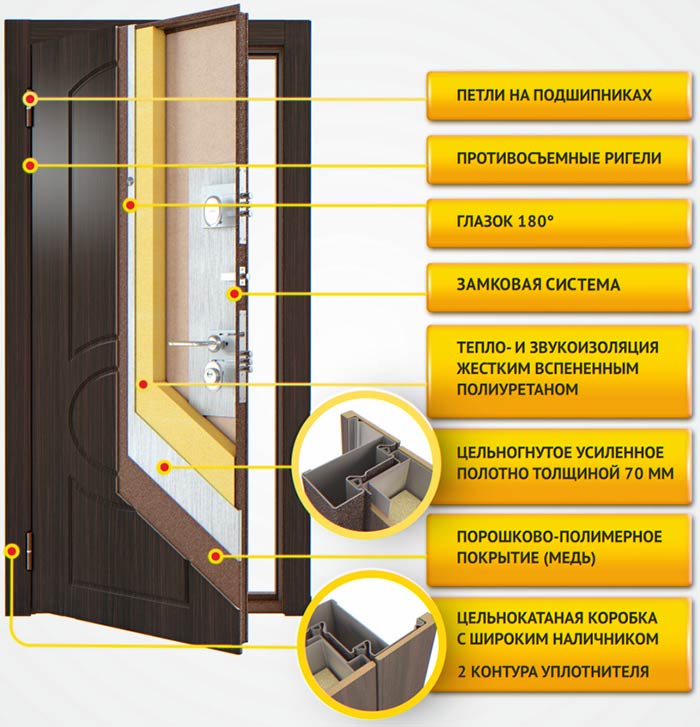 Malerei ist eine spezielle Pulver-Polymer-Beschichtung von ausländischer Produktion auf ausländischen Geräten. Mit dieser Methode können Sie eine dauerhafte Anti-Vandal-Schicht erstellen, die vor verbalen Effekten schützt und das Metall vor Beeinträchtigungen der Integrität schützt. Darüber hinaus ist die innere Komponente mit Polyurethan-Hartschaum gefüllt - eine Substanz mit hohen Hydro- und Schalldämmeigenschaften sowie einer extrem niedrigen Wärmeleitfähigkeit. Dies bedeutet, dass es fast unmöglich ist, es zu durchtränken, und es ist äußerst schwierig, selbst mit dem Einsatz von komplexen chemischen Reagenzien Feuer zu machen.