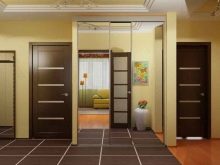 Schiebetüren und "Framir" -Trennwände "öffnen" sich entlang der Wand: Sie schwimmen entlang der installierten Führungen. An der Öffnung sind Führungen angebracht, die als Garderobe dienen. Beachten Sie, dass Schiebesysteme in der Regel teuer sind, aber nicht in der "Framira": Hier können Sie zum Preis des Modells profitabel finden.