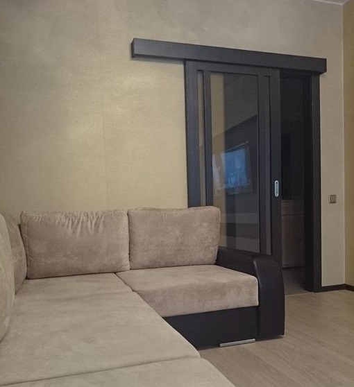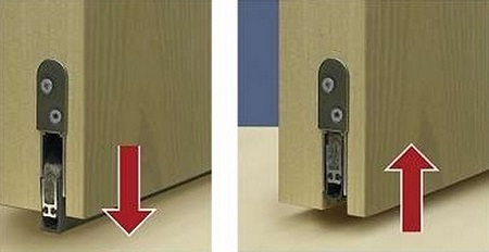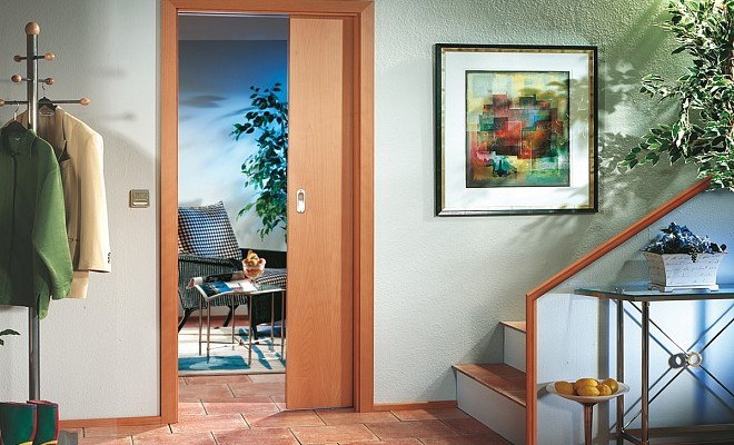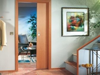 - Türgehäuse: Leinwände eines solchen Systems sind in die Wand eingezogen. Schiebetür kann jeder sein - taub oder komplett aus Glas. Seine Führung ist im unteren Teil der Tür installiert und ist vor neugierigen Blicken völlig verborgen, was die Falltür zu einem stilvollen Element des Interieurs macht.