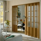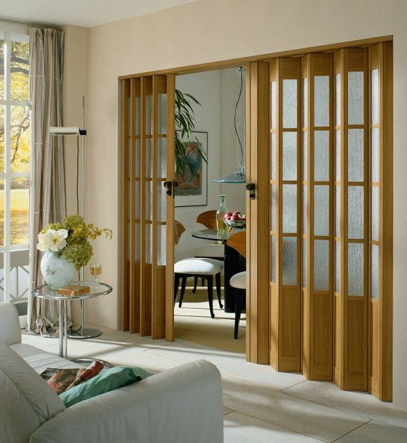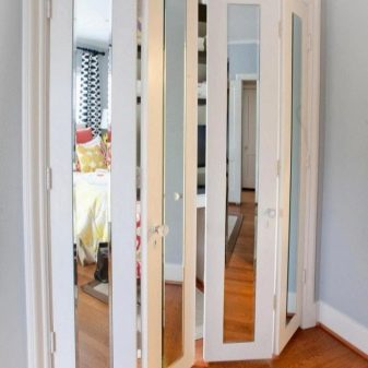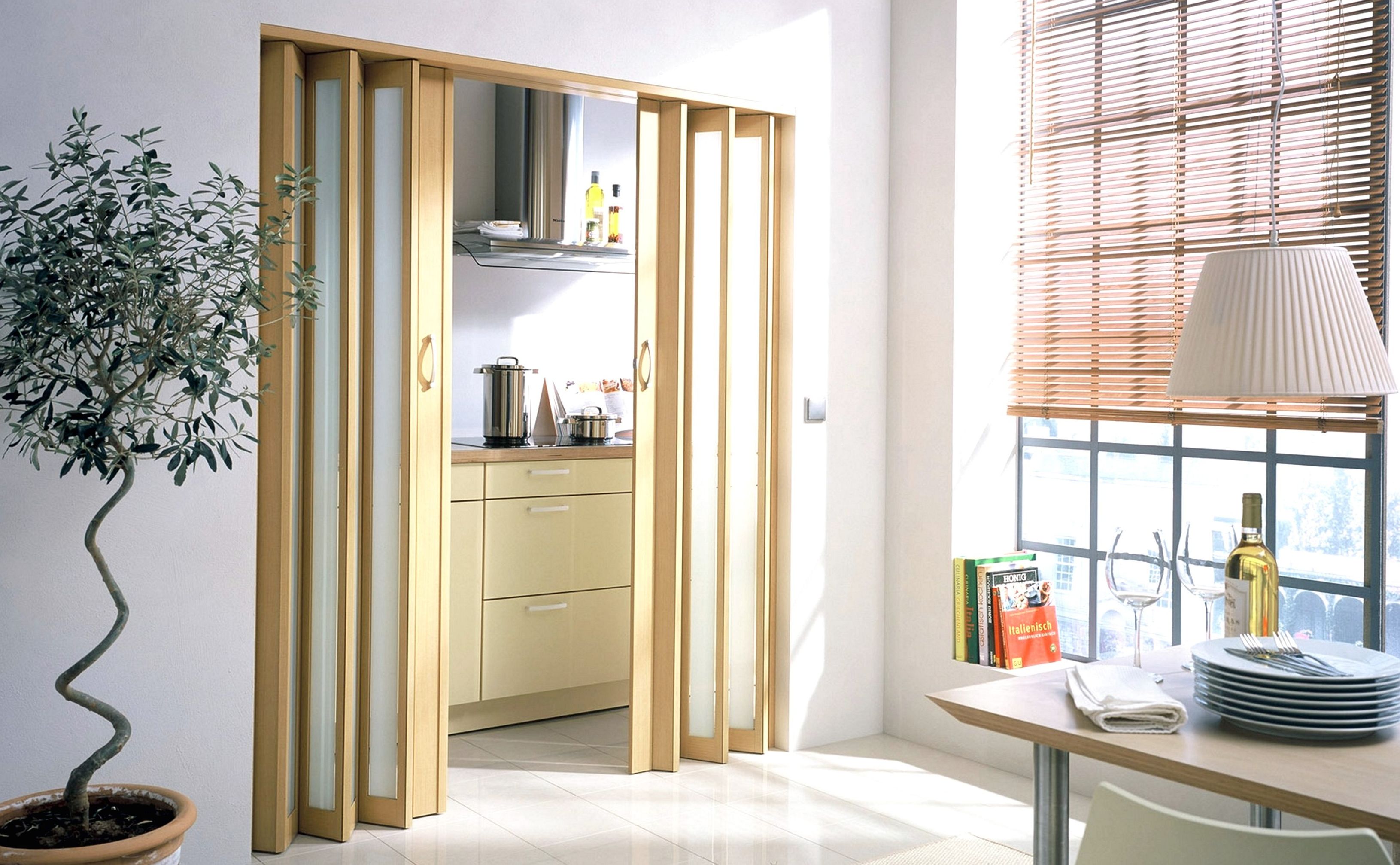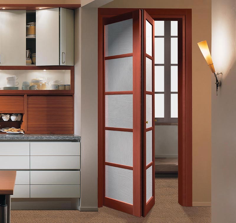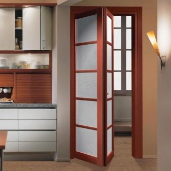 Falt- und Schiebekonstruktionen helfen, Platz zu sparen und zu diversifizieren. Sie öffnen sich seitwärts, gleiten an der Wand entlang oder falten sich zu einem Booklet, das ein wenig Platz spart. Ihre Kosten sind normalerweise höher als bei Swing-Modellen. Aber sie gewinnen, wenn kleine Kinder oder Haustiere im Haus sind: Es ist unmöglich, versehentlich ein Baby oder eine Katze mit einer Schiebetür zu treffen.