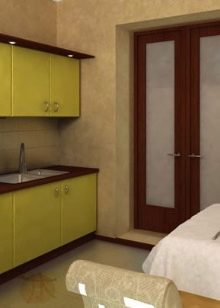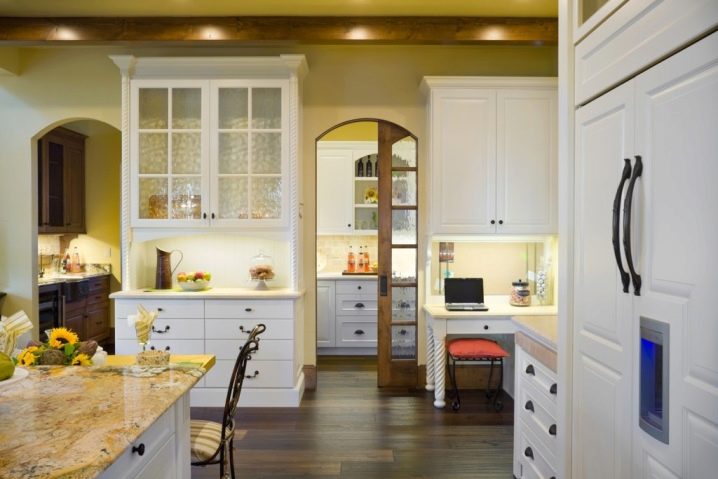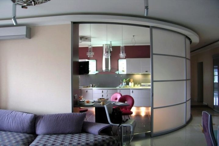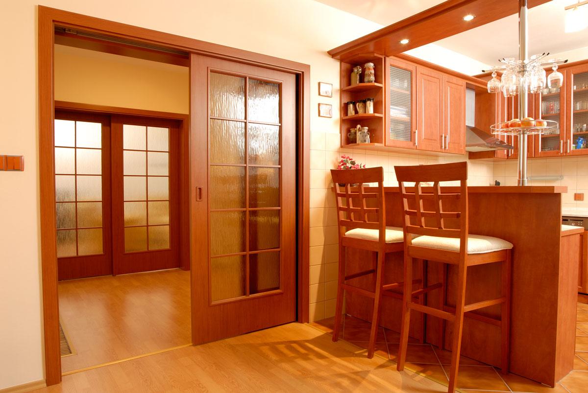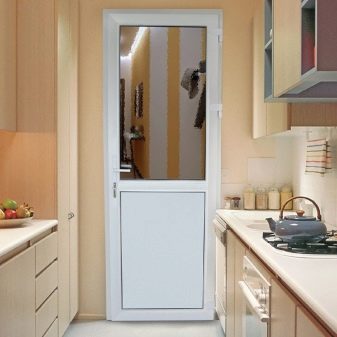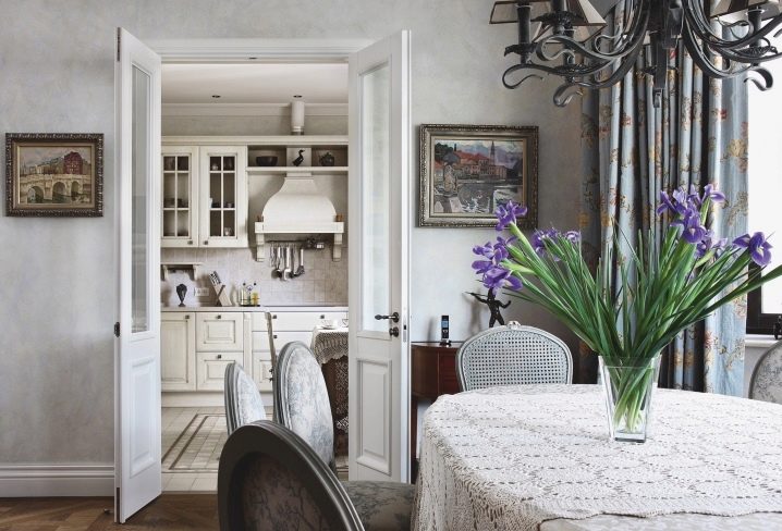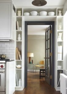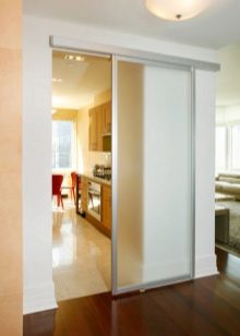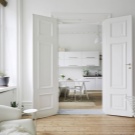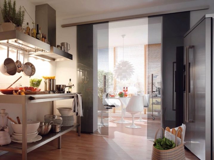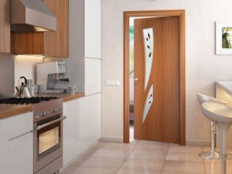 Wenn die Küchentür zum Wohnzimmer oder Esszimmer führt, ist es besser, ein scharniertes oder schiebendes Design oder einen Bogen zu wählen - es wird Räume kombinieren. Es kann eine helle Glastrennwand, eine breite Fachtür, eine schöne Leinwand mit Glas sein.