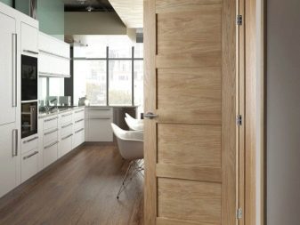 Massivholz ist teuer, auch im Äußeren, Ästhetik und angenehmen Mikroklima, das es im Haus schafft. Diese Leinwand eignet sich für die Küche, vorausgesetzt, die Fläche des Raumes beträgt mehr als 10 Quadratmeter. m und die Tür bekommt kein Wasser und Dampf vom Kochen. Die Leinwand aus Naturholz kann bei zu nassen oder trockenen Räumen aus Dampf oder Wasser verformt werden, so dass sie definitiv ausgeschlossen werden sollten.