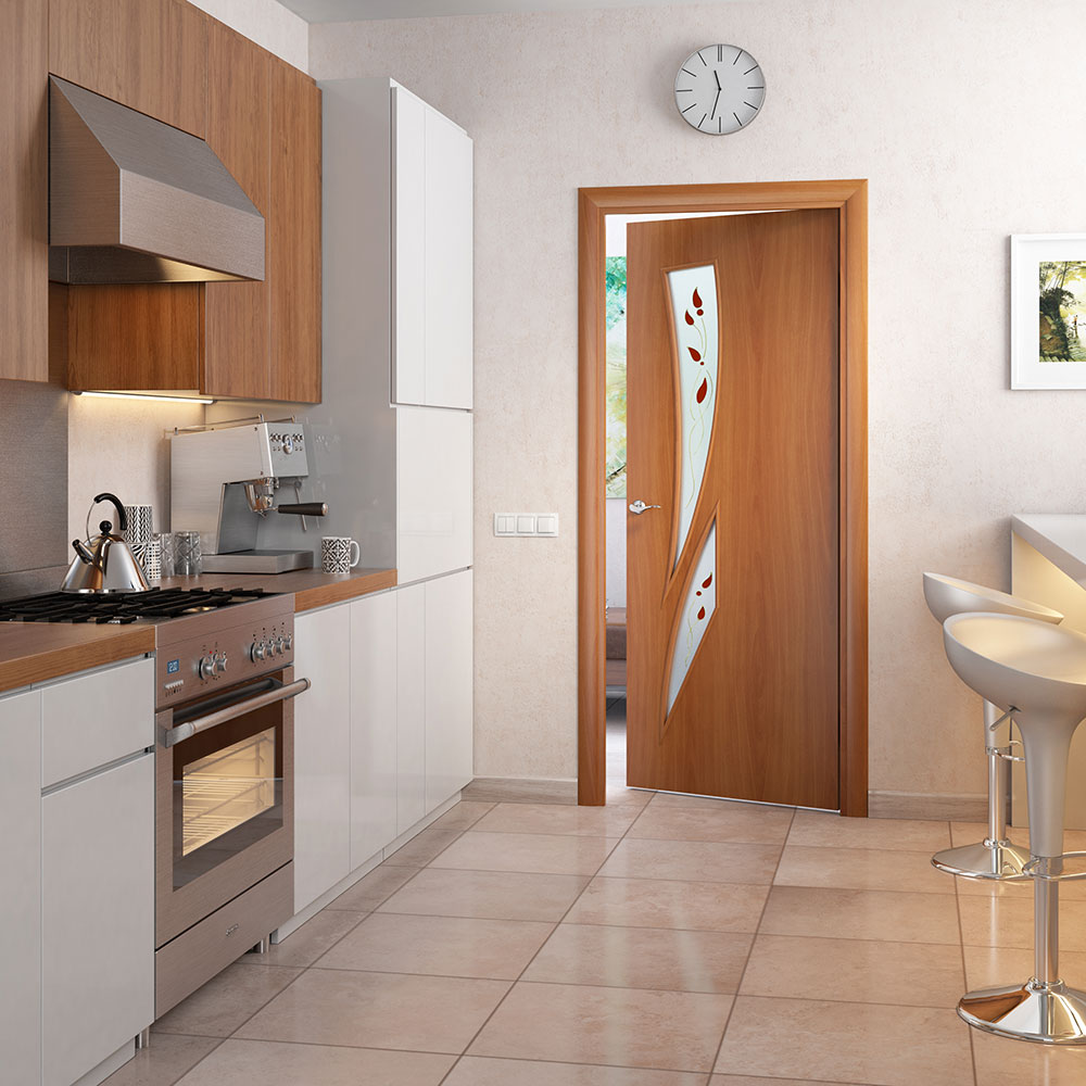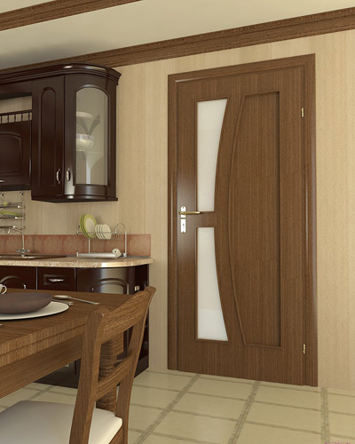 Künstliche Beschichtung wie PVC, Emaille oder laminiertes Gewebe ist auch für die Küche geeignet. Diese Türen werden als Wirtschaft klassifiziert, und sie unterscheiden sich in der äußeren Schale. PVC - Polyvinylfilm, der oft natürliches Holz nachahmt. Es ist billig, verbläßt aber unter direkter Sonneneinstrahlung. Enamel ist eine Farbe, es ist sicher, praktisch, sieht attraktiv aus und hat fast keine Nachteile.