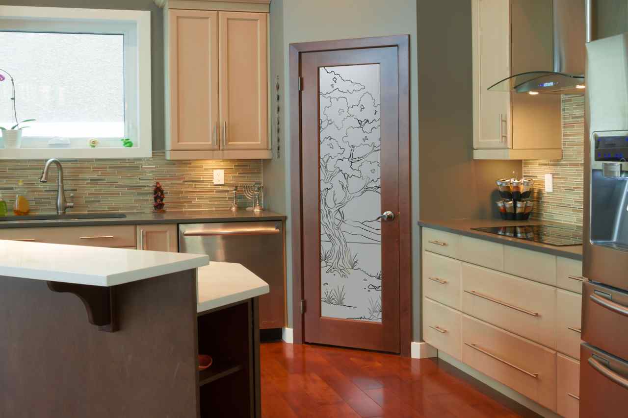 Glastüren erweitern optisch den Raum und machen ihn hell weil sie das Licht leicht hineinlassen. Für die Küche ist eine Vollglasscheibe nicht praktisch: Fingerabdrücke bleiben auf der glänzenden Oberfläche. Die Alternative ist eine Holztür mit Glasdiagonale, vertikal oder horizontal.