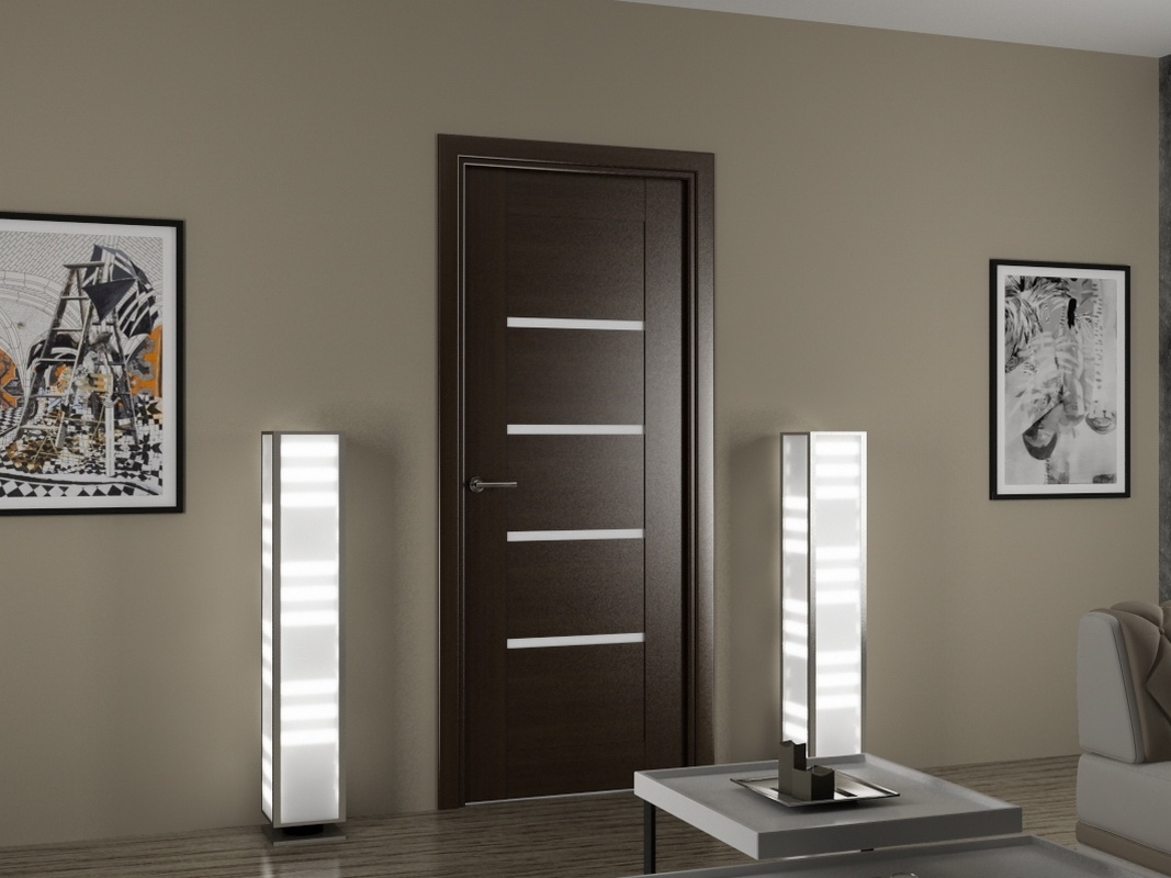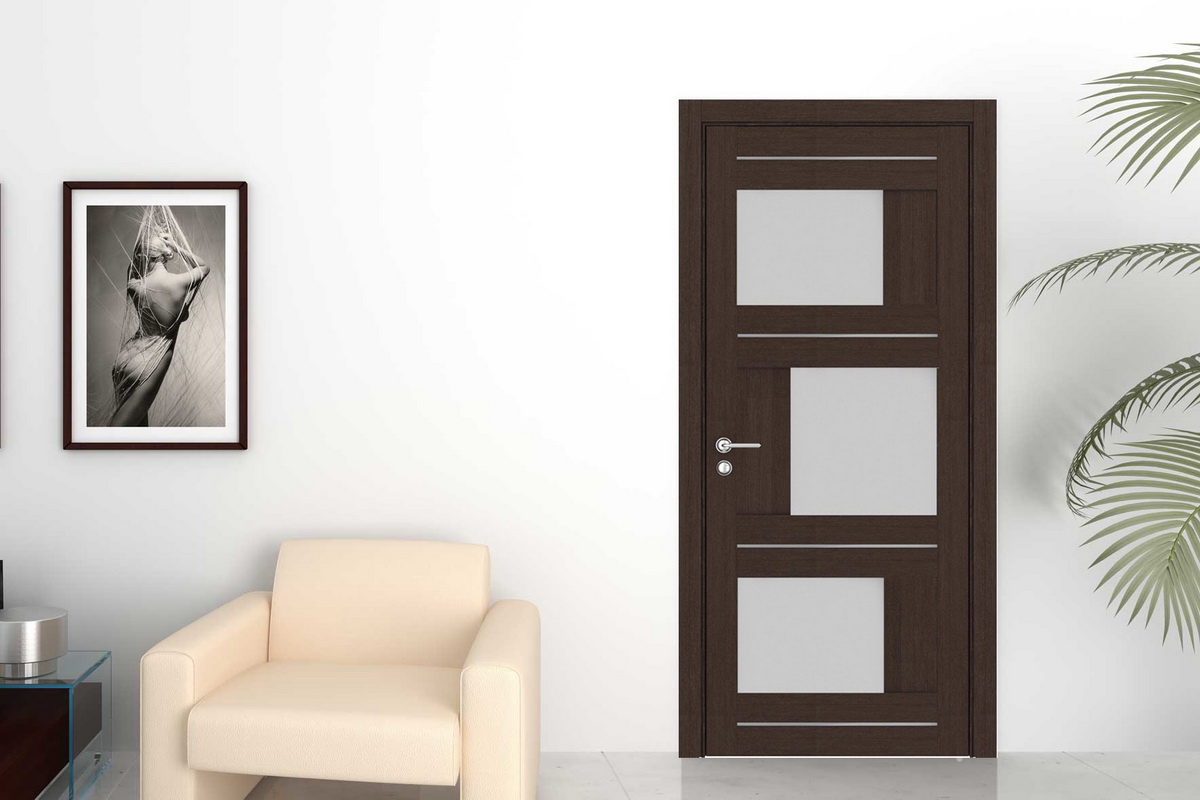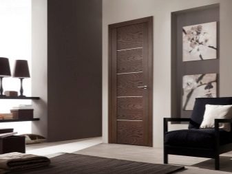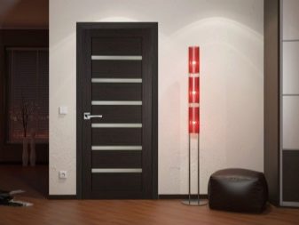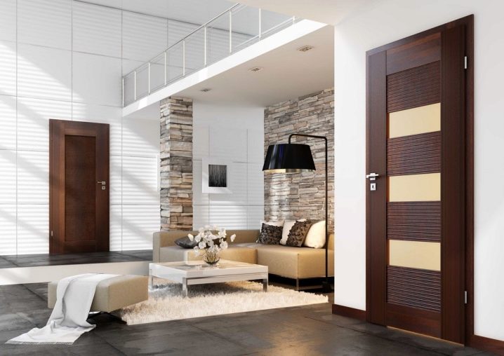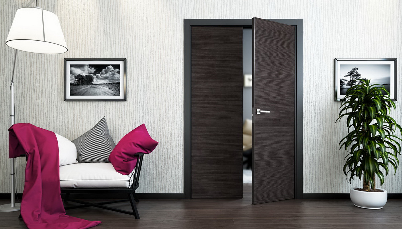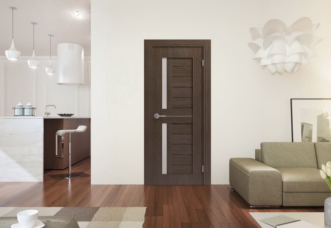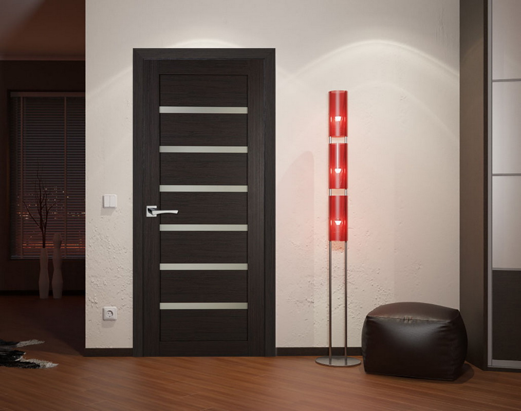 - Farbe von Wenge - Farbe der natürlichen wertvollen Rasse des Holzes.Diese Tür sieht gut aus vor dem Hintergrund der kontrastierenden weißen Ordnung in einem modernen Interieur.