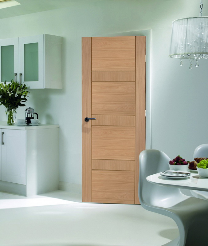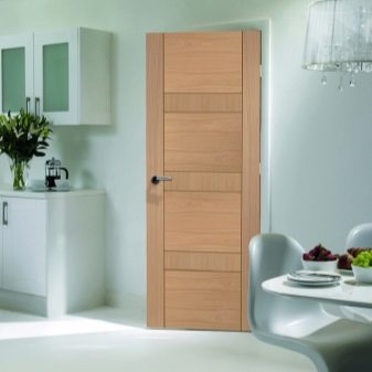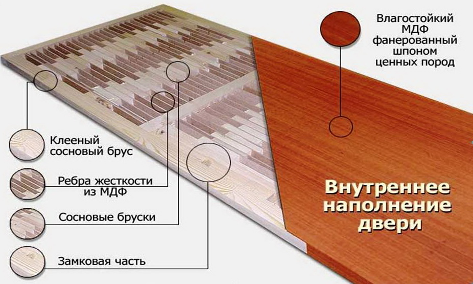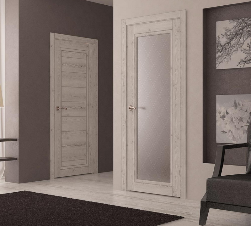 Solide oder gespleißte massive Kiefer behält die Wärme besser und isoliert Geräusche, und solche Türen können selbst mit einer synthetischen Beschichtung mehr als das gleiche kosten.aber billiger als natürliches Furnier und besonders feste Eiche oder Buche.