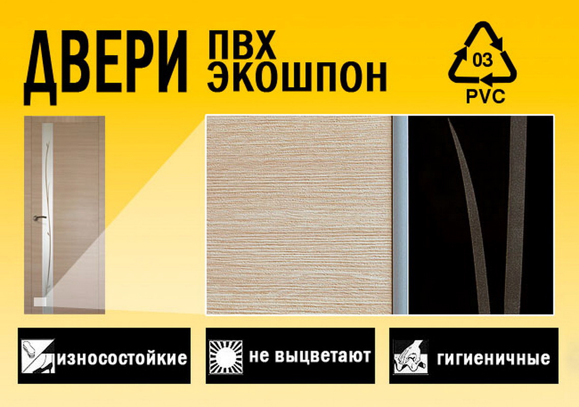 - PVC - Polyvinylchlorid. Schon aus dem Namen geht hervor, dass dieses Material eine Chlorid-Komponente enthält, die in normalen Grenzen sicher ist. PVC-Material ist eine Folie, die durch Pressen auf den Stoff aufgebracht wird und sich im Unterschied zur gleichen Ekoshpon in vielen verschiedenen Farbtönen unterscheidet. Plus PVC-Türen und dass sie billiger sind als der Rest. Innen sind sie fast immer Wabenfüller aus Pappe, sie sind außen mit MDF veredelt und mit Folie abgedeckt. Ihre Lebensdauer wird von 5-7 Jahren bestimmt.