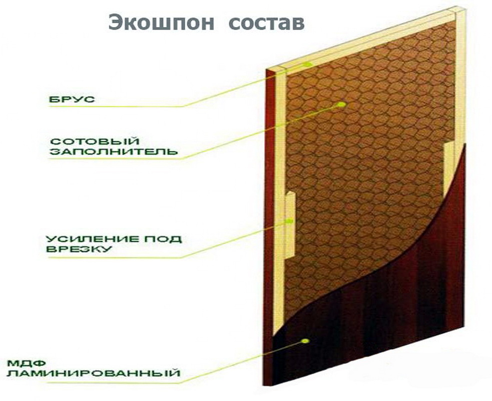 - Abmessungen der Leinwand Je dicker die Tür, desto besser (wenn wir über das ekoshponon sprechen). Solch eine Leinwand wird nicht zu massiv sein, aber sie kann extrem dünn sein, aber dies wird die Schall- und Wärmeisolierung beeinträchtigen;