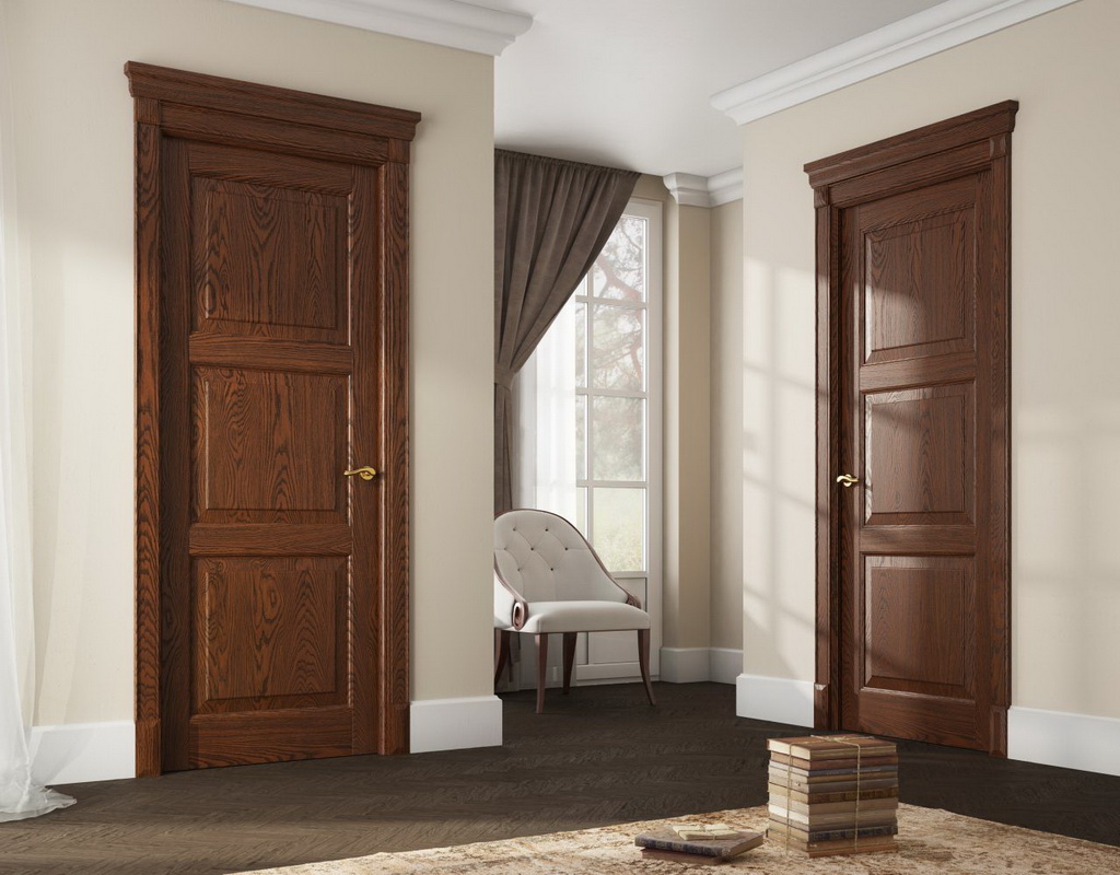 - Ein gutes Beispiel sind braune Türen einer strengen Form im modernen Stil. Moderner weißer Klassiker, der trotz der künstlichen Materialien in der Dekoration der Leinwand teuer und elegant aussieht.