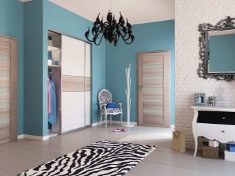 Kreative Menschen können sich kräftige Farblösungen leisten. Zum Beispiel, wenn die Farbe an den Wänden von hellen Schattierungen, dann ist die Tür am besten vollständig weiß wählen.Dieser Innenraum wird frisch und stilvoll aussehen.