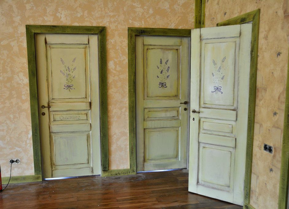 - In der Wohnung mit der Richtung Country-Musik oder Provence Designer empfehlen, Originaltüren aus hellen Farben mit dem Effekt des Alterns einzubauen.