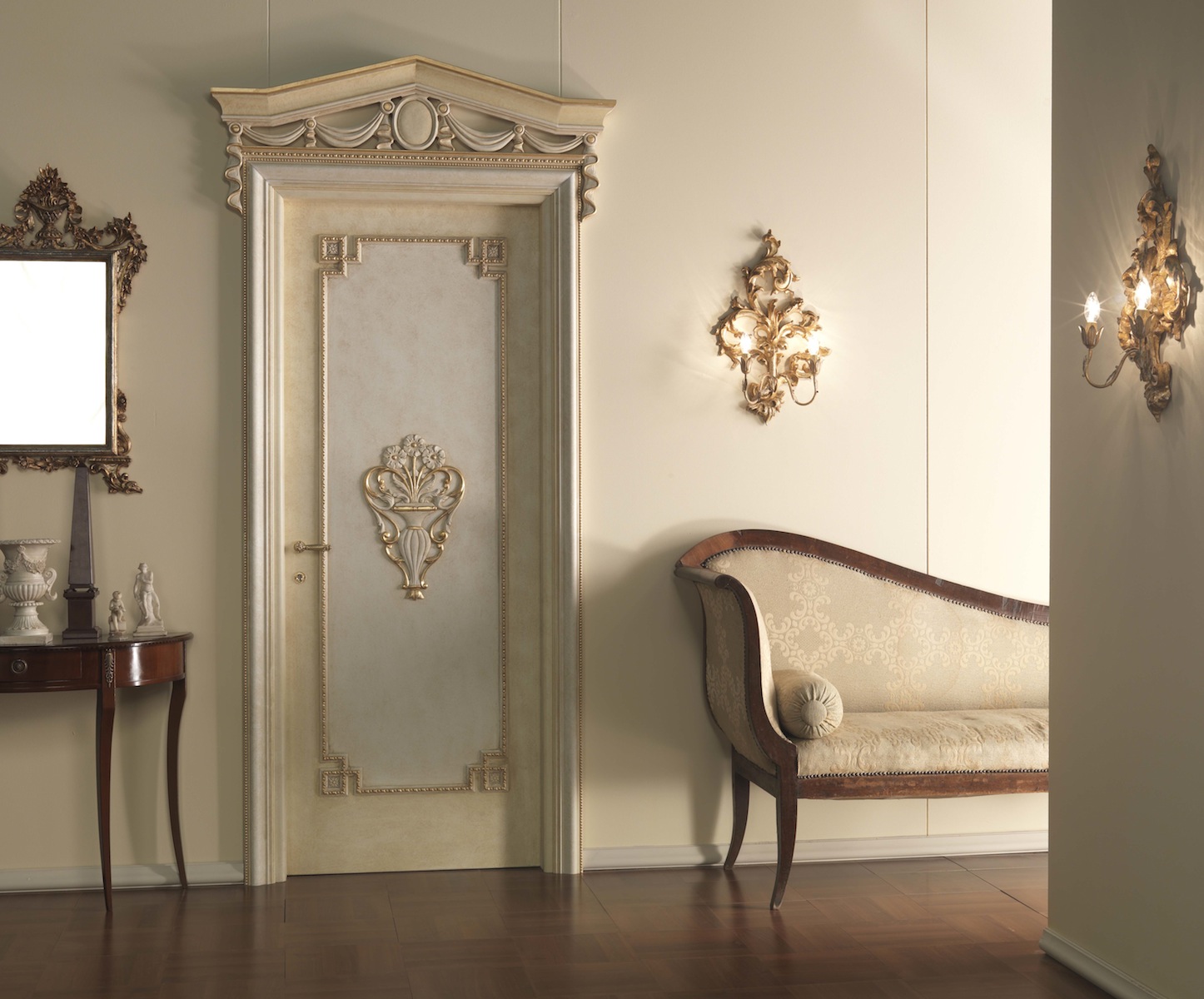 - Barock zeichnet sich durch seinen eigenen Pomp, Reichtum und Luxus aus. Daher muss die Tür entsprechend ausgewählt werden. Zum Beispiel massive Lichtprodukte aus einem natürlichen Baum mit einer Kunstschnitzerei und einem vergoldeten Dekor.