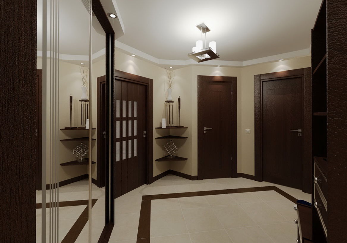 Dunkle Türen verleihen dem Raum Raffinesse und ziehen die Aufmerksamkeit aller auf sich. Aber vor dem Kauf solcher Farbtöne ist es wert zu wissen, dass sie nicht in einem kleinen Raum passen, und auch auf dunklen Produkten sind Schmutz und verschiedene Defekte sehr auffällig. Wenn die Türprodukte von den Zimmern aus der gleichen Halle zugewandt sind, ist es am besten, sie in demselben Stil, derselben Farbe, Textur und demselben Dekor anzubringen. So wird die einheitliche Wahrnehmung des Raumes nicht gebrochen.
