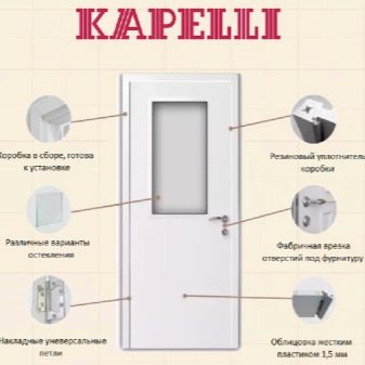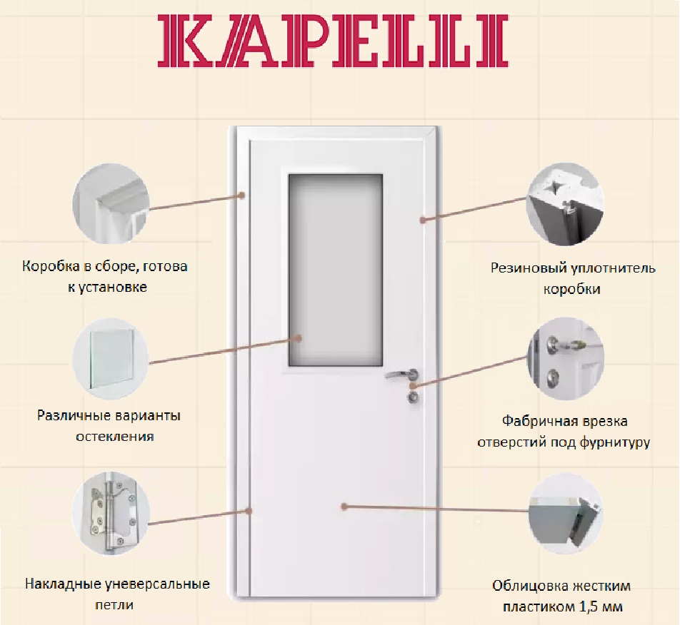 - Kapelli Clasic. Modelle haben eine hohe Feuchtigkeitsbeständigkeit, Wärme- und Schalldämmung, Brandschutz, Haltbarkeit und einfache Installation. Sie können solche Türen sogar selbst installieren. Für die Verkleidung klassischer Türen verwendete Kapelli wärmebeständige PVC-Platten, die als sehr langlebig gelten. Der innere Teil der Tür besteht aus feuchtigkeitsbeständigem Material. Alle Elemente dieser Art von Modellen werden als sehr hochwertig angesehen, wodurch die Haltbarkeit des Produktes selbst dann gerechtfertigt ist, wenn sich die Türen regelmäßig öffnen und schließen.Bei den klassischen Türen sollten Sie auf Modelle mit Bullaugen und glatte Modelle achten, die perfekt in den minimalistischen Stil passen.