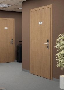 - Türen der Stahlwirtschaftsklasse. Die Veredelung erfolgt durch Vinyl-Kunstleder - das kostengünstige Material, das beständig gegen die erhöhte Feuchtigkeit ist und die guten Schallschutzeigenschaften besitzt. Vinyl-Leder ist in einer glatten und strukturierten Versionen, in einer breiten Farbpalette und mit verschiedenen Effekten, zum Beispiel mit Nachahmung von Naturleder;