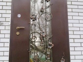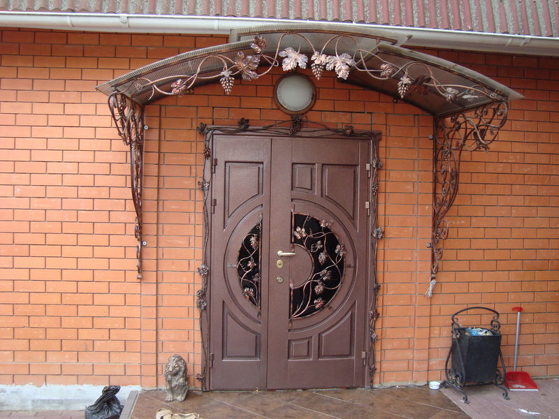 - Metall Eingang zum Haus. Sie haben die gleichen Vorteile wie die Eingangstüren für Wohnungen, sind jedoch auf Witterungsbeständigkeit eingestellt. Türblatt ist resistent gegen plötzliche Temperaturänderungen und die Auswirkungen von Niederschlag. Oft werden solche Modelle in der kombinierten Version mit Glas- oder Glaseinsätzen hergestellt. Geschmiedete Elemente in solchen Produkten übernehmen neben der dekorativen Funktion eine Schutzfunktion und schützen das Glas zuverlässig vor Beschädigungen;