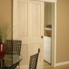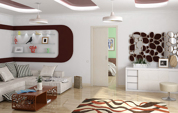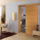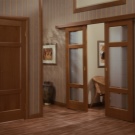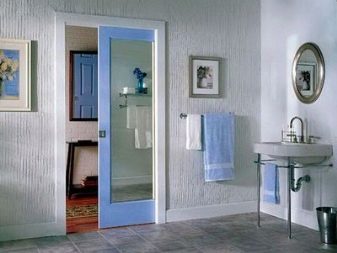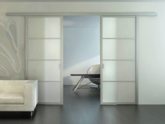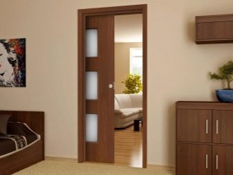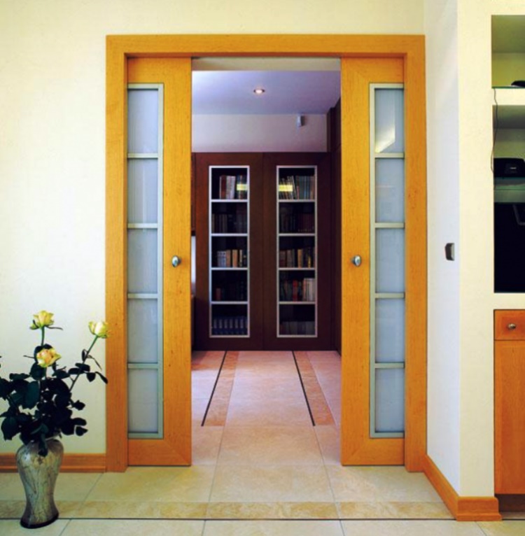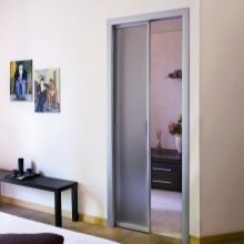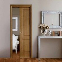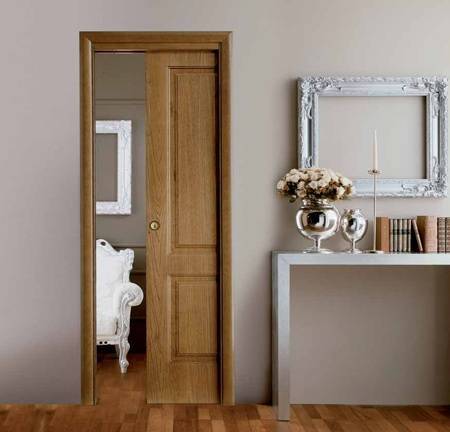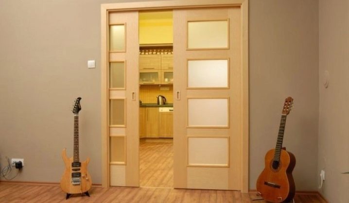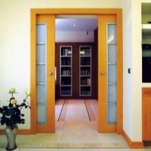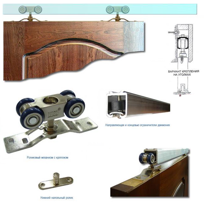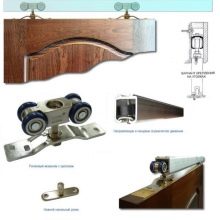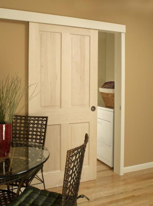 Das Design ist in Form einer Führungsschiene aus Metall undHolz, das mit Rollen ausgestattet ist. Es ist auf ihr und setzt die Leinwand, und die Bewegung wird entlang des Führers ausgeführt. Die unterschiedliche Konfiguration der Kassette hängt von der Gestaltung des Türblattes ab. Kassetten sind aus Sperrholz, Holz, Trockenbau.