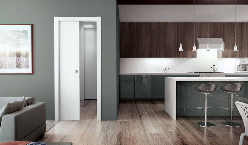 Das Türgehäuse ist ein verschiebbares Design, das mit einem Spezialfall funktioniert,in die Wand eingebaut. Er verbirgt die gesamte Leinwand der Tür, so dass die Tür nicht wie üblich aufschwingt.