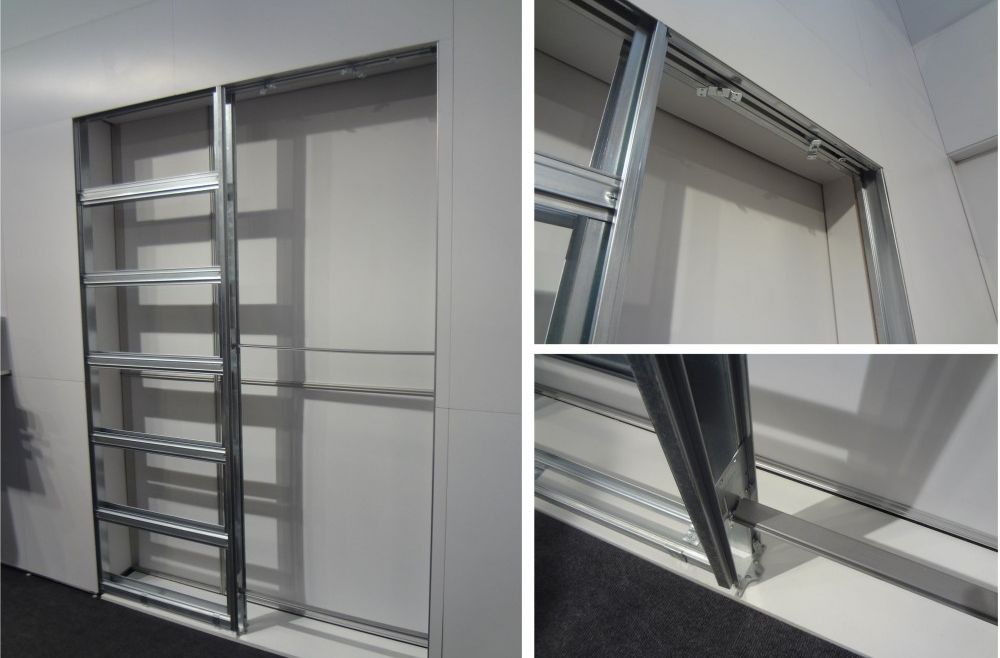 - Geschlossener Typ - Es wird bei der Konstruktion in die falschen Wände eingebaut, wo auch die Kassette für die Schiebetür montiert wird. Das Design des Mechanismus hat eine gewisse Größe, so dass es die Wand ein wenig breiter macht, aber der nützliche Platz, der beim Verbergen der Tür in der Kassette erhalten wird, gleicht dieses Minus mehr als aus. In der Stützwand ist ein solcher Mechanismus in einem angebrachten Behälter montiert, dessen Strukturen mit Trockenbauwänden vernäht sind;