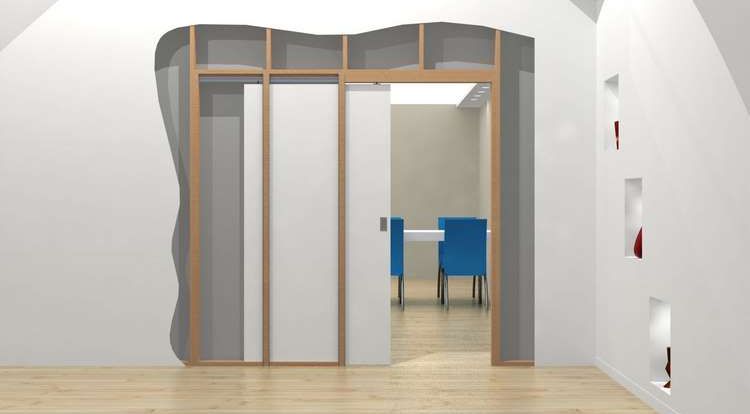 Die nicht tragende Wand zur Befestigung der Kassette ist zu demontieren. Einfach ausgedrückt, ist es notwendig, es einfach zu zerstören, und an seiner Stelle, um eine Partition mit eingebauter Nische genau die Abmessungen des Türblattes zu bauen. Diese Konstruktion wird als falsche Wand bezeichnet, sie umschließt eine Kassette für Einzel- oder Doppelschiebetüren. Diese Technik ermöglicht es, die gleiche Dicke der Wand zu lassen, wodurch Sie die maximale Anzahl an nützlichen Quadratmetern im Raum sparen können.