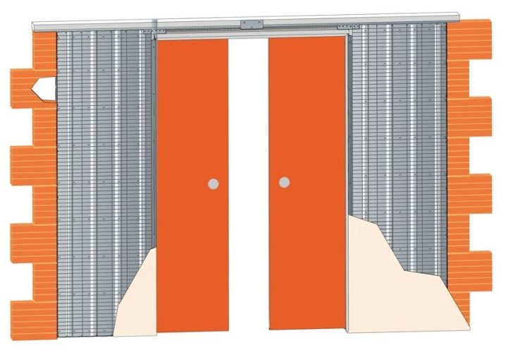 Wenn die Türöffnung breit ist - mehr als einen Meter, ist es notwendig, zweischalige Ausrüstung zu haben. Diese Konstruktion zeichnet sich durch die Installation einer Doppelkassette aus, dh für jedes Blatt wird eine separate Platte installiert, die Leinwände haben ihre eigenen Kanister. Und verbindet sie miteinander einen Guide.