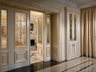 Geschnitzte Türen werden nach verschiedenen Kriterien klassifiziert: Installationsmethode, Zweck, Art des Pflügens und Größe.