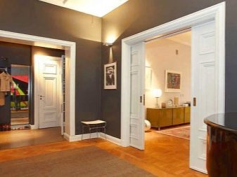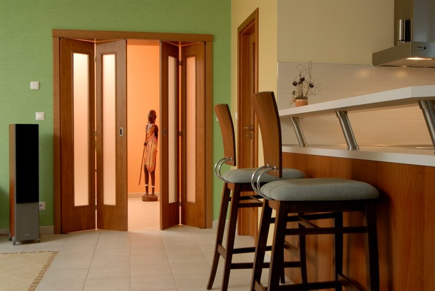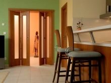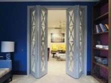 Wenn Sie keine Flügeltüren installieren möchten, können Sie sich für nicht standardmäßige Optionen entscheiden - Schieben, Akkordeon oder ein Buch. Solche Designs sehen ungewöhnlich aus, und das Akkordeon ist auch platzsparend, so dass es perfekt für kleine Wohnungen ist.
