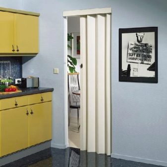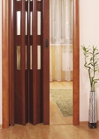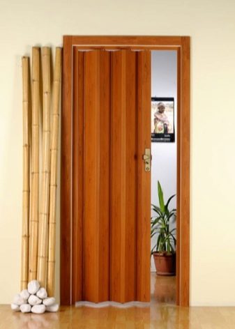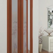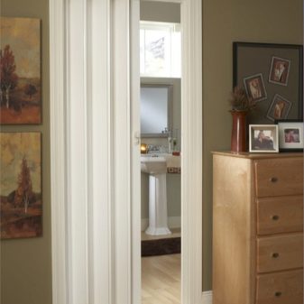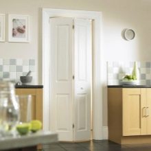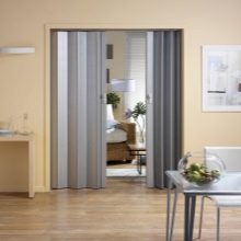 - Akkordeon. Der einfachste Weg, Faltmodelle des Akkordeon-Typs zu installieren. Zunächst ist es notwendig, eine Tür für die Installation solcher Strukturen vorzubereiten.Nach den notwendigen Vorarbeiten müssen Sie den Türrahmen über die Gebäudeebene montieren. Die Box ist notwendig, damit sie beim Öffnen der Klappstruktur Abschnitte enthält.