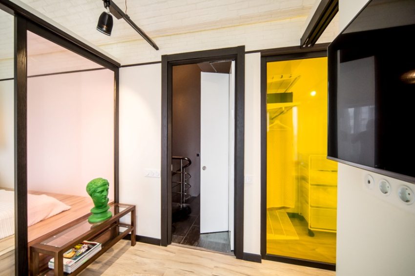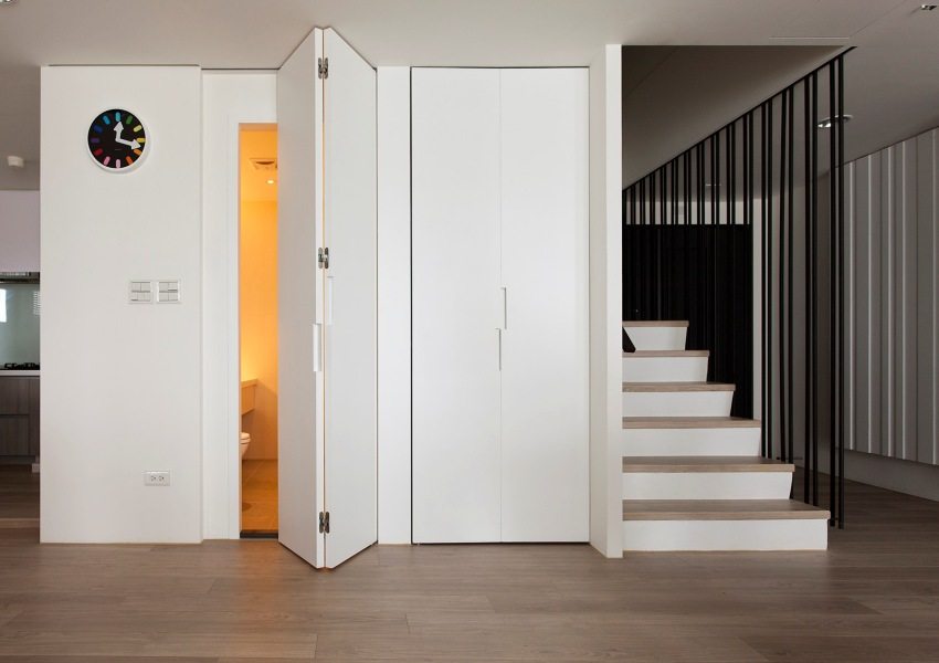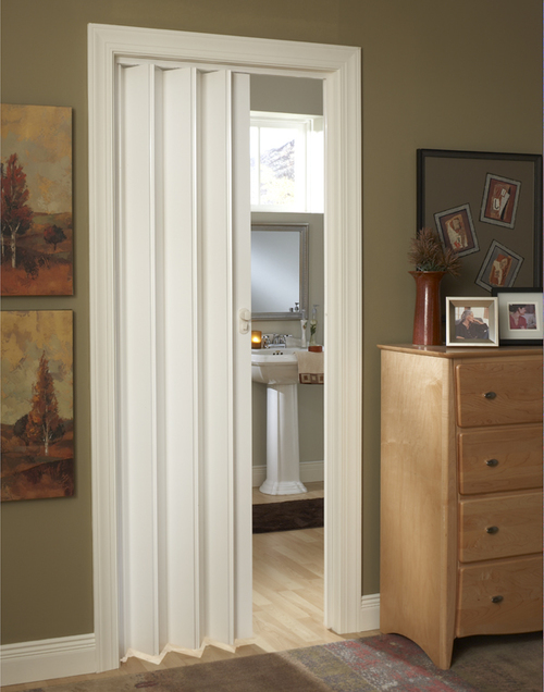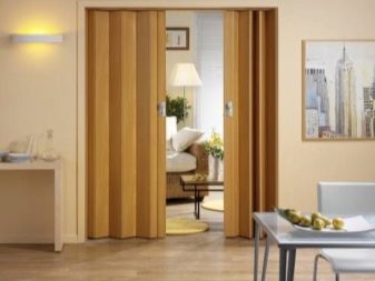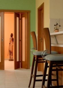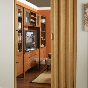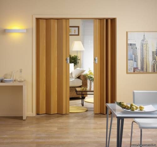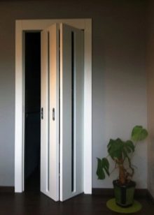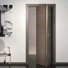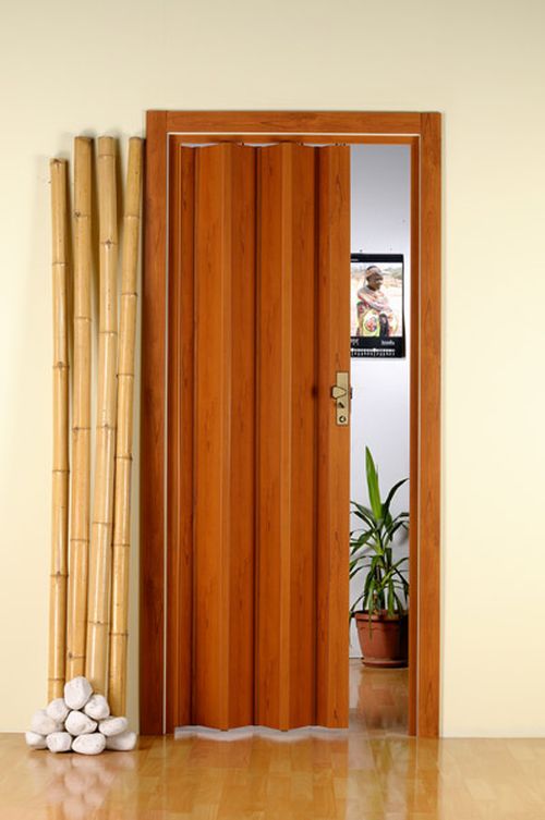 - Sie helfen, Platz im Raum zu sparen. In diesem Fall müssen Sie keinen Platz zum Öffnen der klassischen Tür bereitstellen. Deshalb sind sie eine ausgezeichnete Lösung für Besitzer von Wohnungen mit einer kleinen Fläche. Solch eine Tür kann sogar in einem engen Korridor installiert werden, wenn es keine Möglichkeit gibt, eine klassische Konstruktion zu platzieren. Die Falttür wird nur einen sehr kleinen Raum um die Tür herum einnehmen. Typischerweise haben solche Strukturen eine geringe Dicke und ein sehr geringes Gewicht, was das Hauptmerkmal von Falttüren ist.