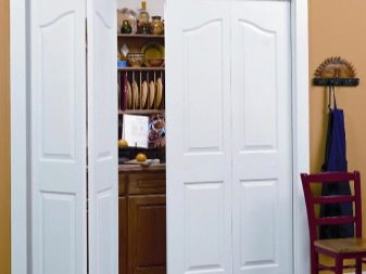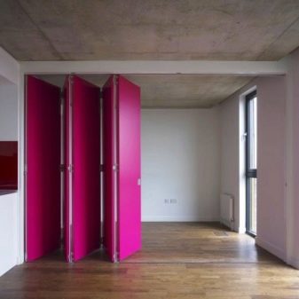 Solche Türen werden auch als Möbeltrennwände verwendet. Sie werden anstelle von Bildschirmen in Schlafzimmern, Kinderzimmern und Umkleidekabinen verwendet. Sie lösen das Problem der Zoneneinteilung. Diese Türen können in jeder Breite der Gänge installiert werden, sogar in den schmalsten. Deshalb sind sie perfekt für eine Vorratskammer in der Wohnung.