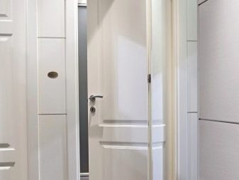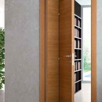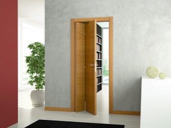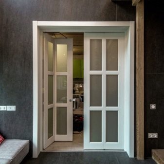 Sie maximieren den Platzbedarf rund um die Türöffnung. Zusätzlich zum Türblatt enthält der Mechanismus einen Seitenkasten, in dem zum Zeitpunkt des Öffnens der Tür alle Abschnitte verborgen sind, die eng aneinander passen. Somit übersteigt die Dicke der Struktur, wenn sie gefaltet ist, nicht die Dicke eines solchen Türrahmens.