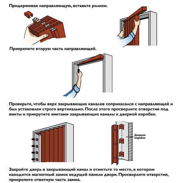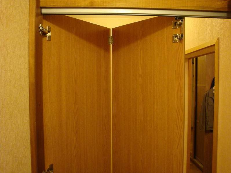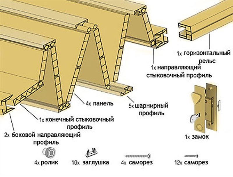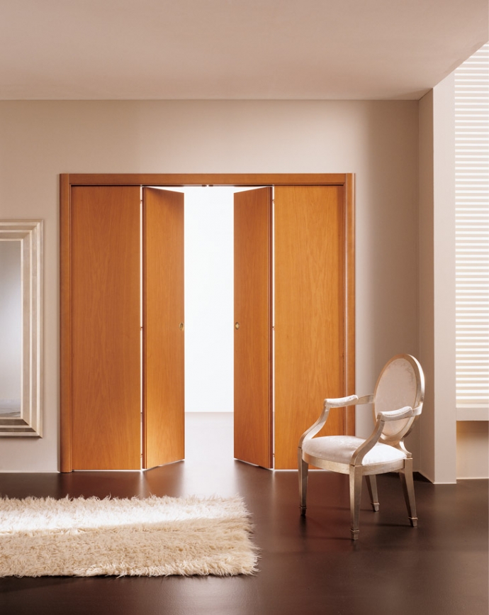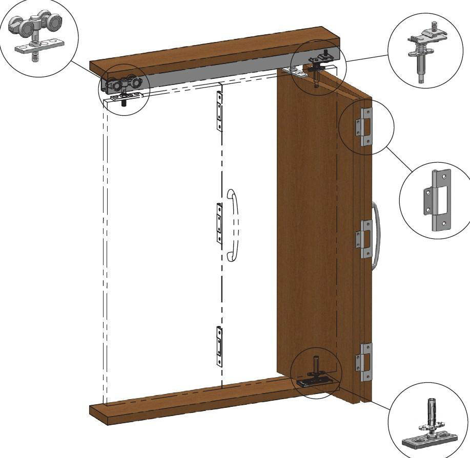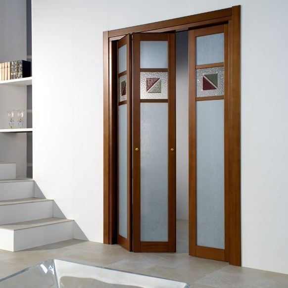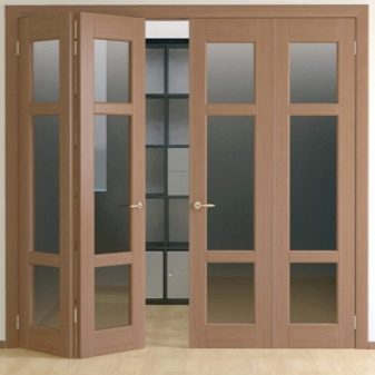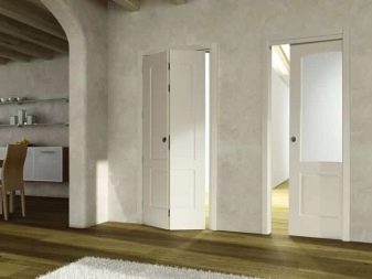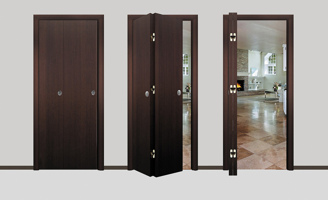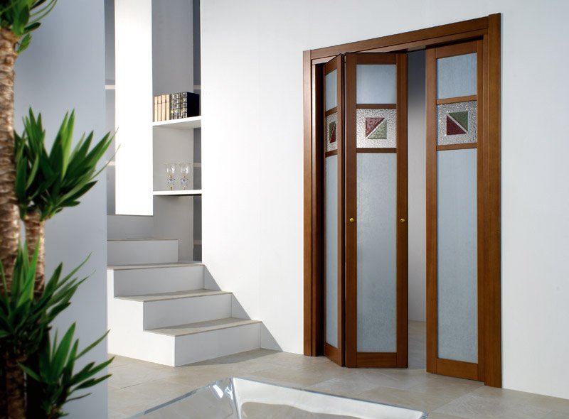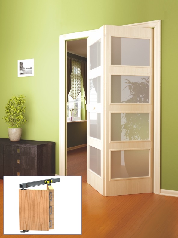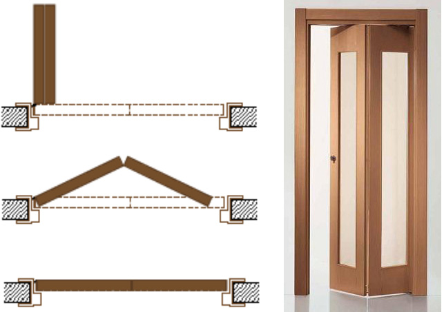 Die Türen mit einer zweiflügeligen Konstruktion haben eine separate Rolle an jedem solchen Abschnitt, und die Türen-Akkordeon haben mehr als zwei Abschnitte, deshalb sind die Rollen nicht an jedem schmalen Abschnitt, sondern durch einen befestigt. Es gibt auch drehbare Falttüren.