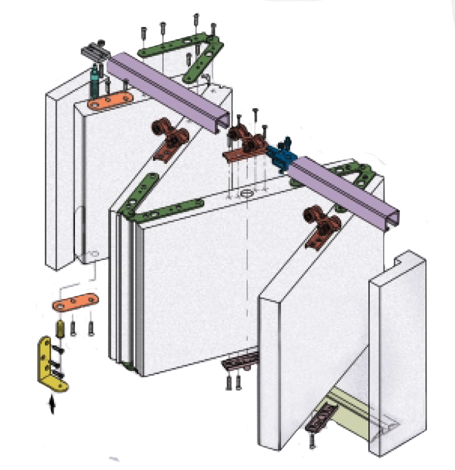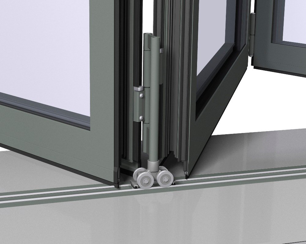 Ein Merkmal des Falttürmechanismus ist, dass jeder Abschnitt durch Scharniere verbunden ist, die von den Augen verborgen sind.Wenn Türen geschlossen und geöffnet werden, werden sie im Türblatt platziert.